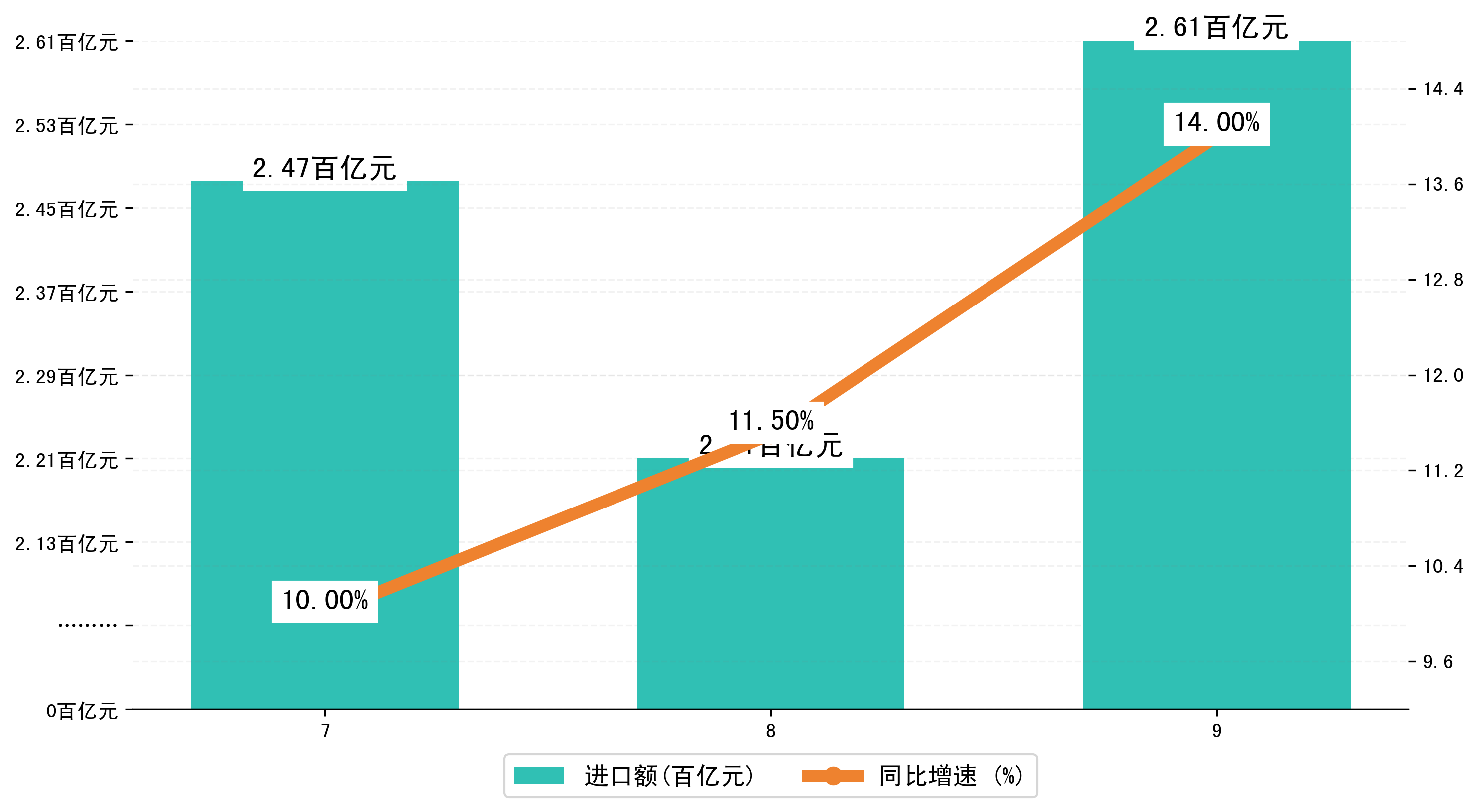 以人民币计,2025年9月湖北省进口额为260,8700.123万元,相比上月增加了40,2992.557万元;相比上年同期增加了61,6463.5133万元,同比增加了14.00%。