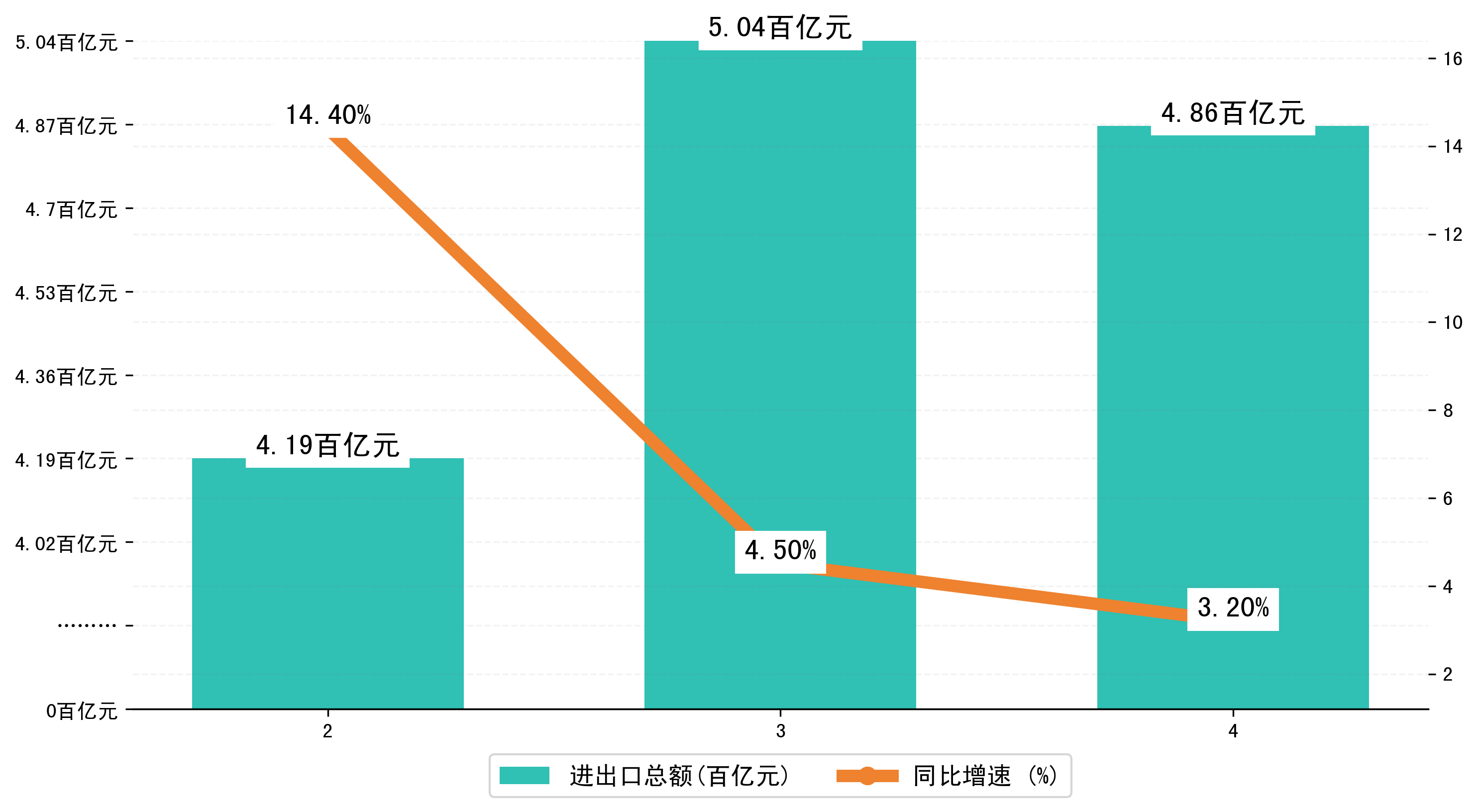 以人民币计,2023年4月湖北省进出口总额为486,2440.6397万元,相比上月减少了17,3495.6241万元;相比上年同期减少了8,1318.4675万元,同比增加了3.20%。