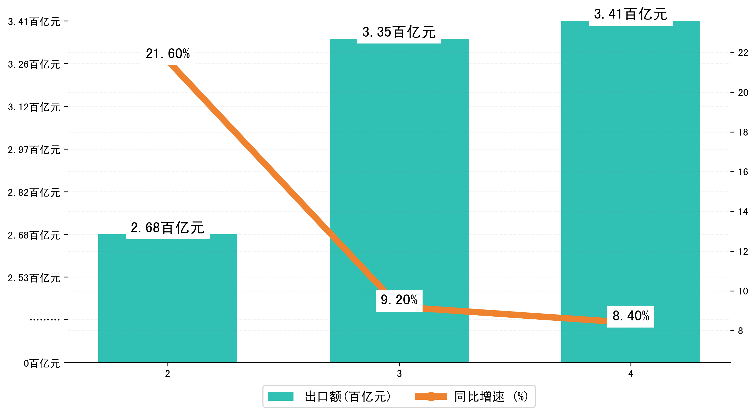 以人民币计,2023年4月湖北省出口额为340,7719.6845万元,相比上月增加了6,1792.9211万元;相比上年同期增加了15,5055.3992万元,同比增加了8.40%。