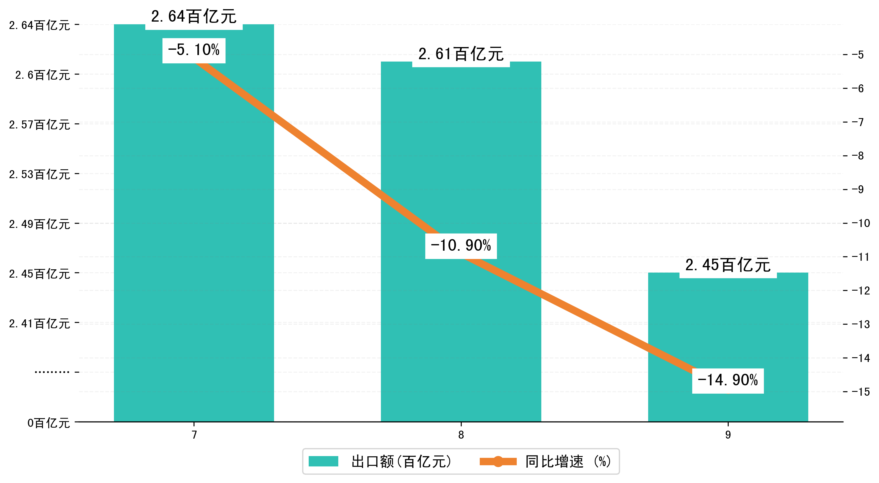 以人民币计,2023年9月湖南省出口额为244,8860.7184万元,相比上月减少了16,5674.7989万元;相比上年同期减少了192,4235.3865万元,同比减少了-14.90%。