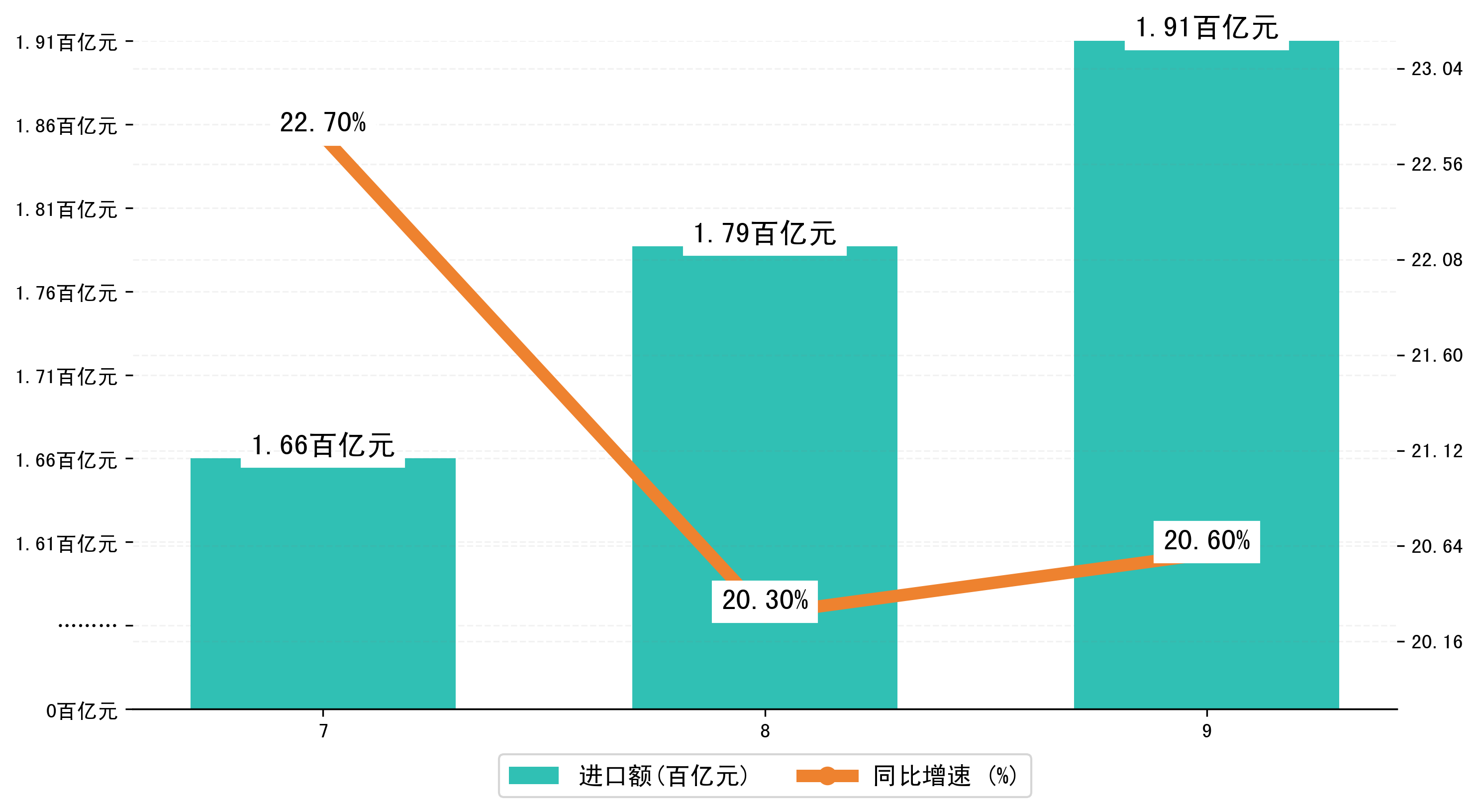 以人民币计,2023年9月湖南省进口额为191,1787.3801万元,相比上月增加了12,5435.1484万元;相比上年同期增加了32,0470.9977万元,同比增加了20.60%。