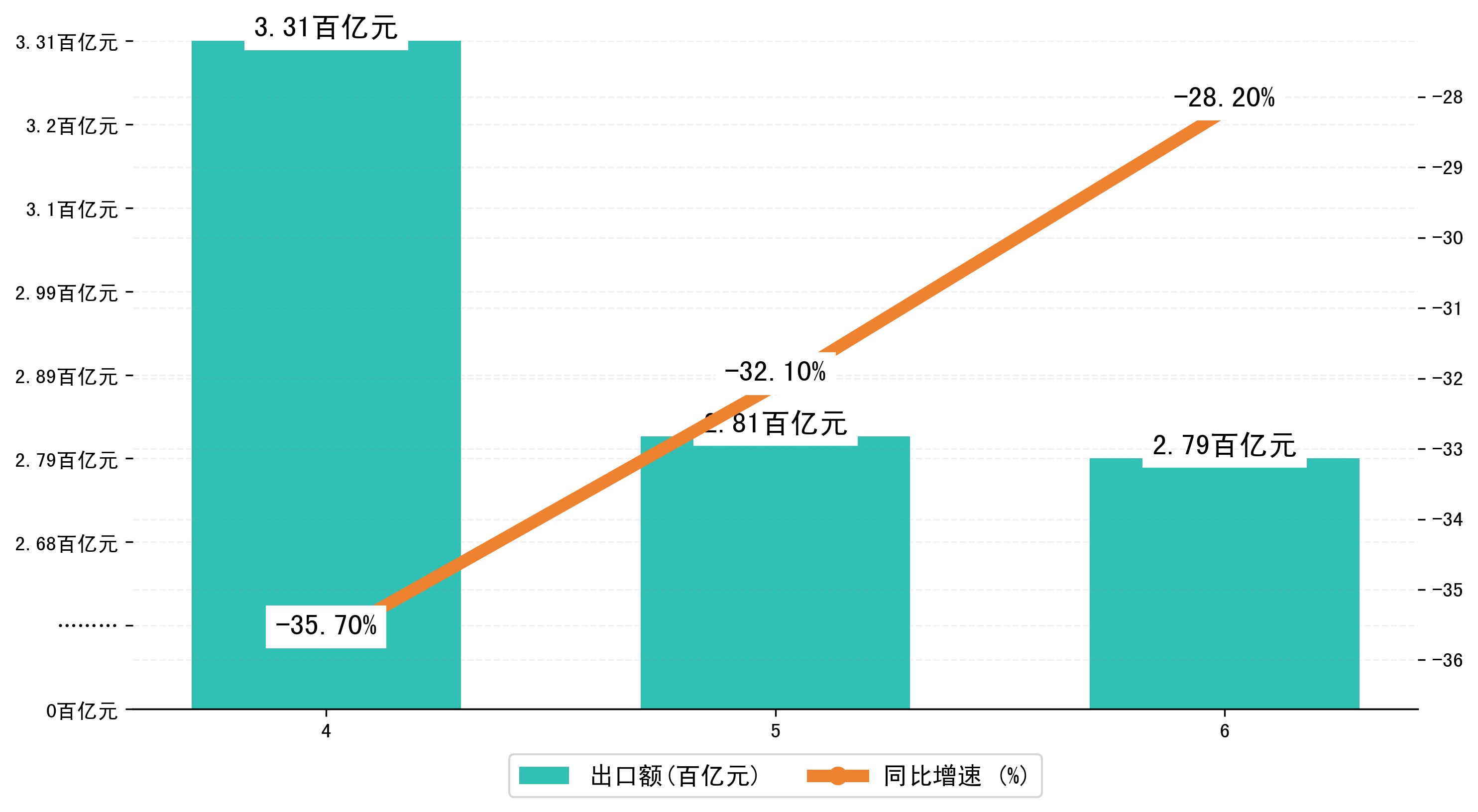 以人民币计,2024年6月湖南省出口额为278,7133.4342万元,相比上月减少了2,7396.9397万元;相比上年同期减少了2,6323.1062万元,同比减少了-28.20%。