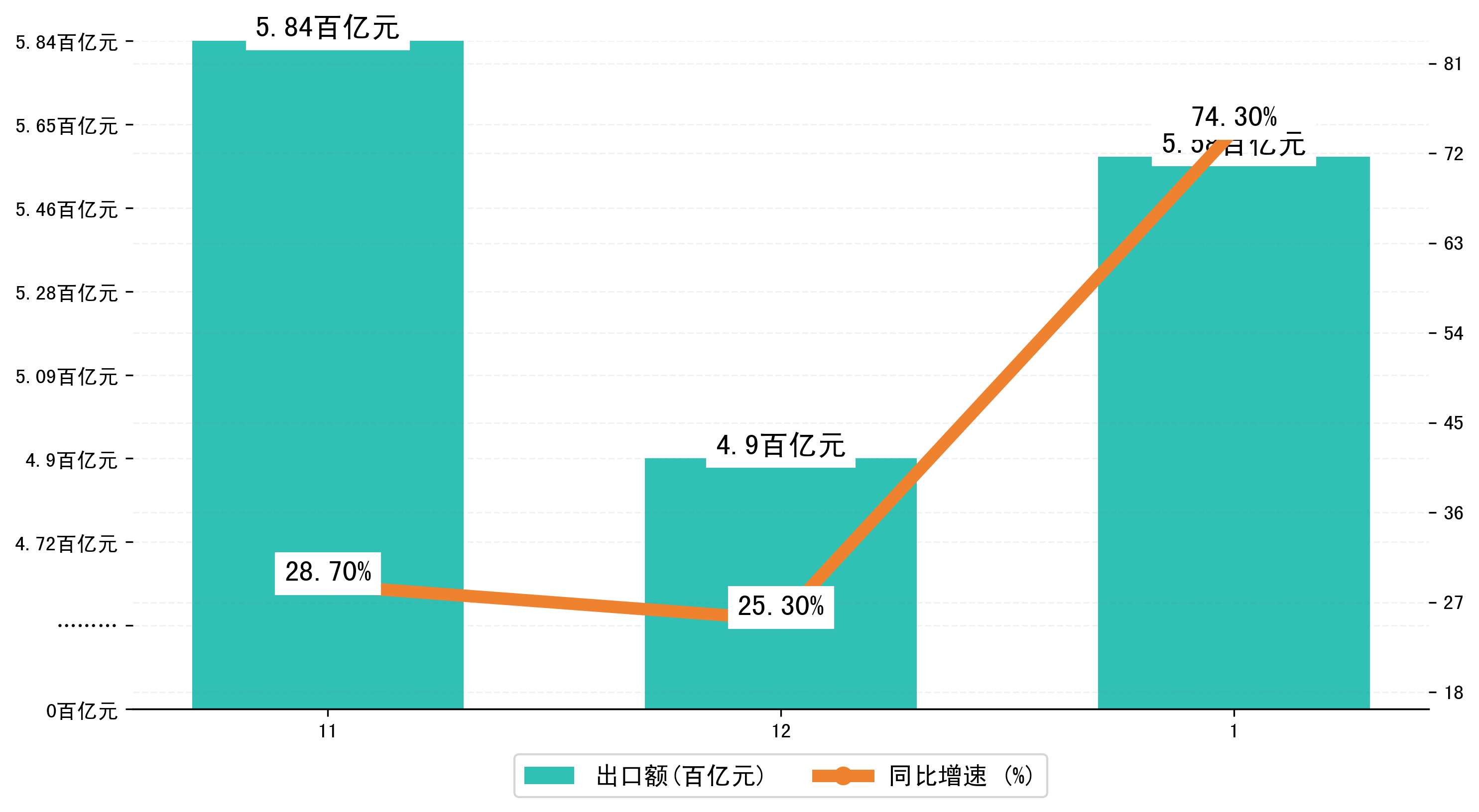 以人民币计,2023年1-1月湖南省出口额为557,6435.0347万元,相比上年同期增加了231,7990.5972万元,同比增加了74.30%。