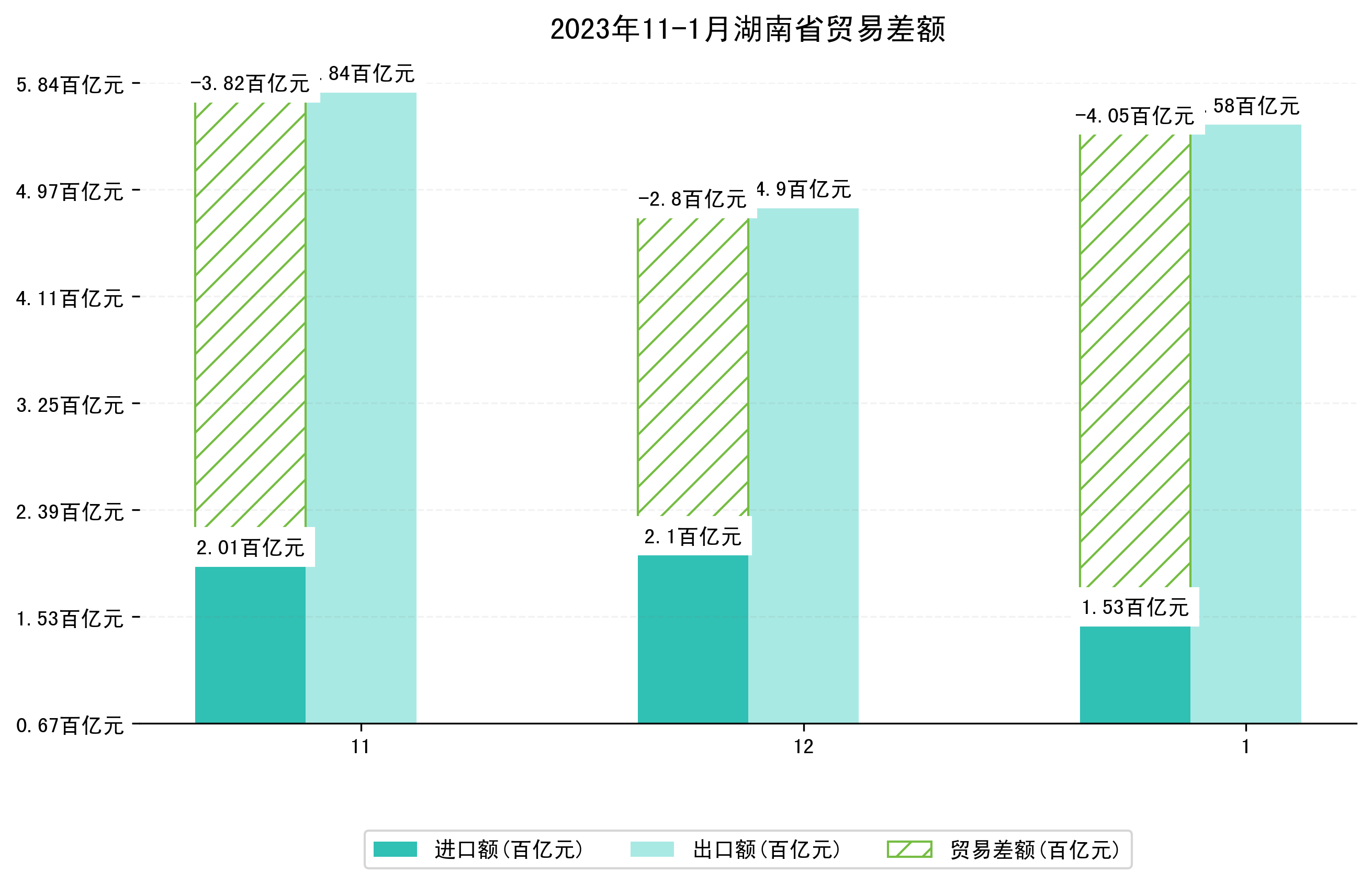 以美元计,2023年1-1月湖南省贸易差额为58,0368,2678万美元(贸易顺差),相比上年同期增加了31,8196,2819万美元,同比增加121.37%。