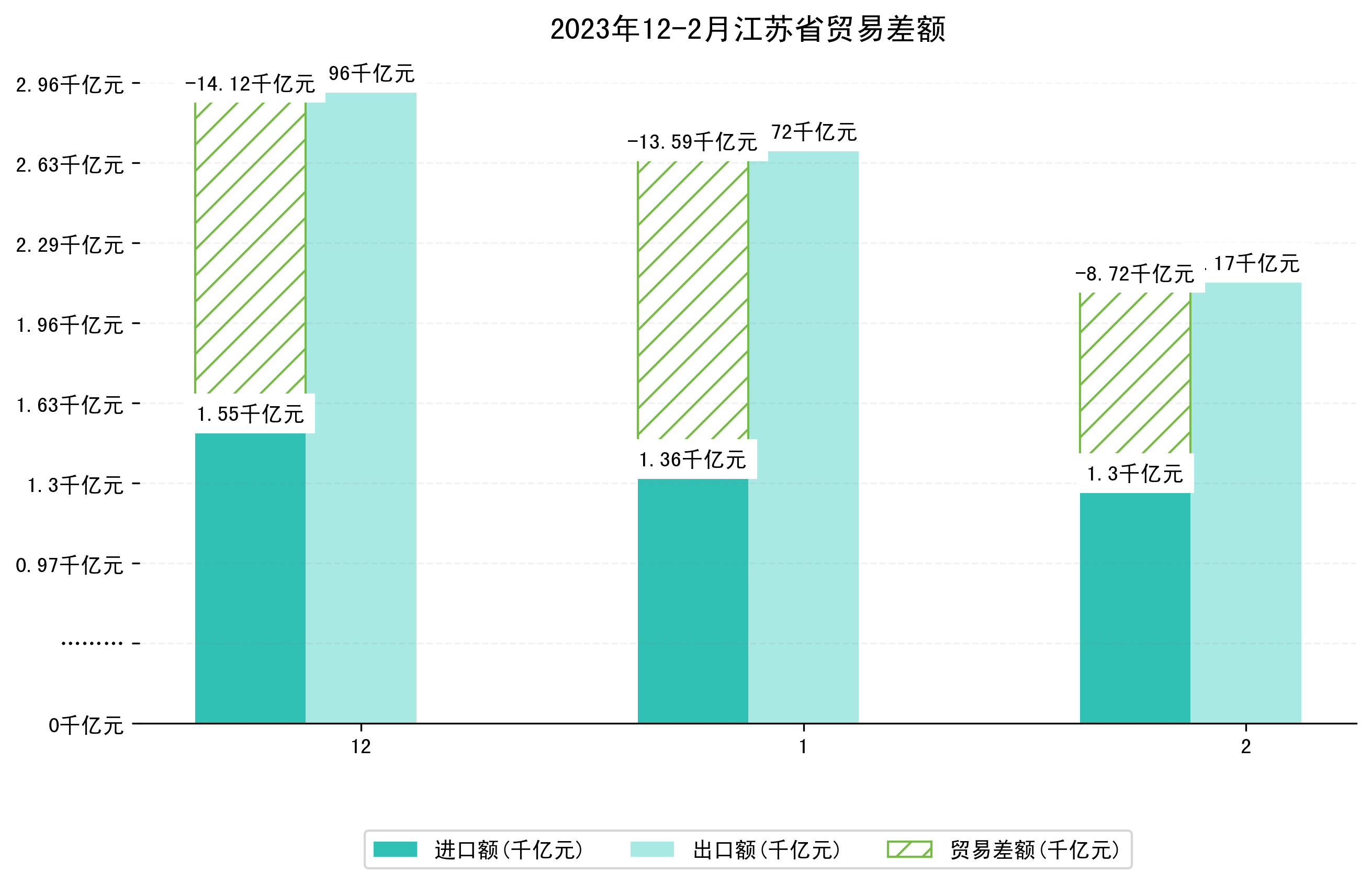 以人民币计,2023年1-2月江苏省贸易差额为2230,5848,2684万元(贸易顺差),相比上年同期增加了192,9662,2930万元,同比增加9.47%。