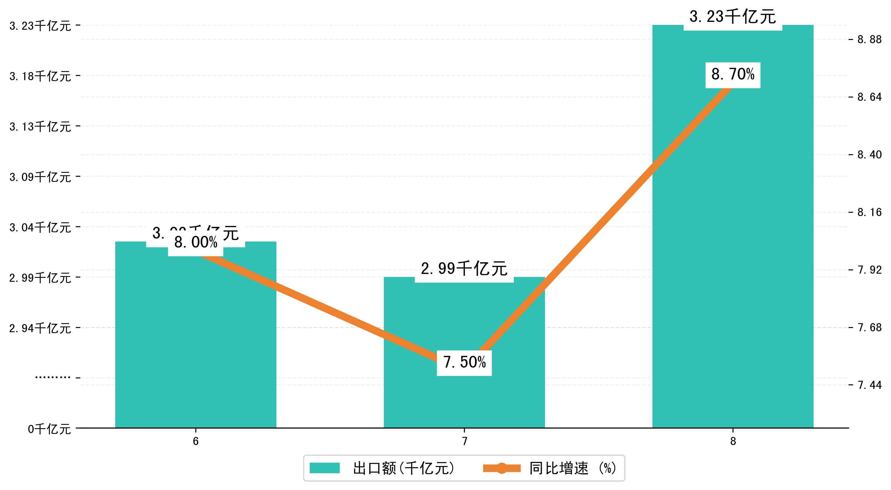以美元计,2024年1-8月江苏省出口额为3298,5412.8248万美元,相比上年同期增加了191,2171.8474万美元,同比增加6.30%。