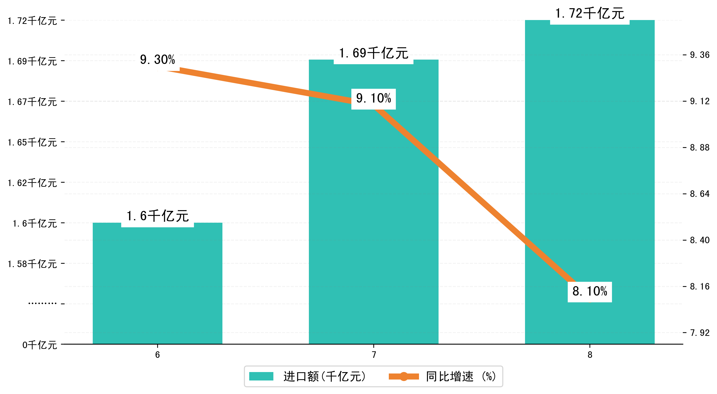 以人民币计,2024年8月江苏省进口额为1717,7911.9123万元,相比上月增加了23,0469.0257万元;相比上年同期增加了41,8055.096万元,同比增加了8.10%。