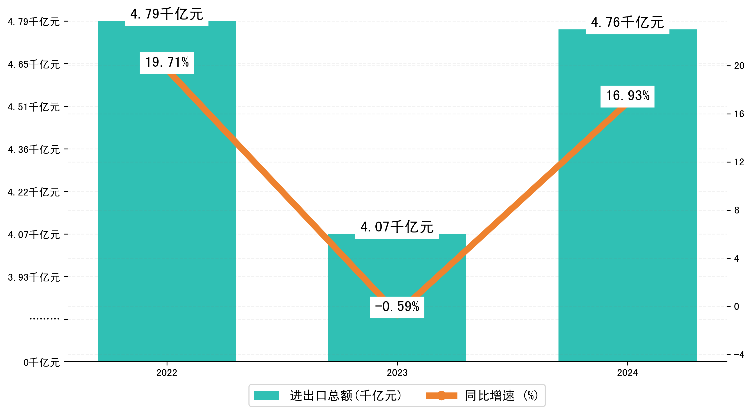 以人民币计,2024年1月江苏省进出口总额为4764,7415.3619万元,相比上月减少了49,5908.3101万元;相比上年同期增加了689,8911.2554万元,同比增加了17.60%。