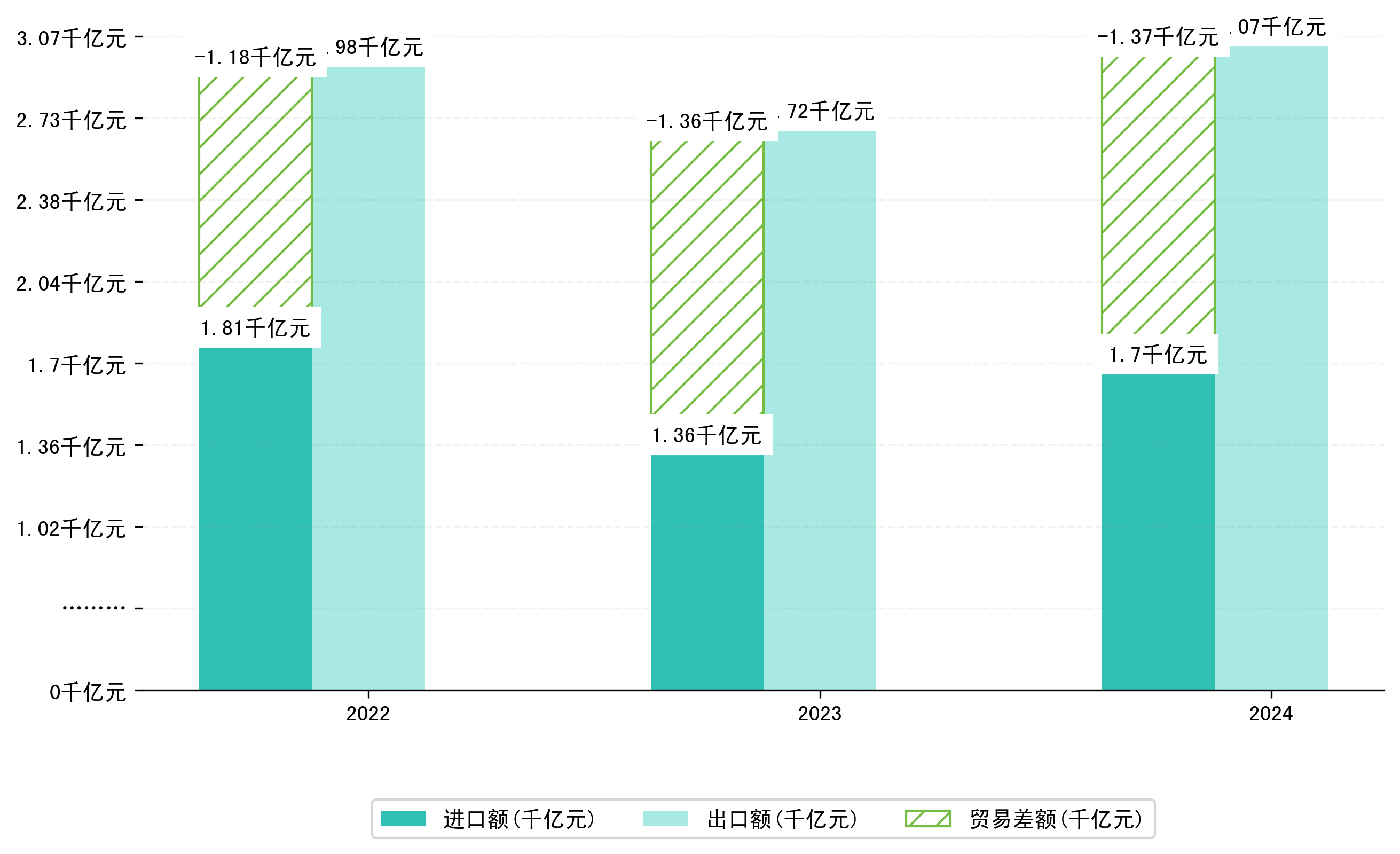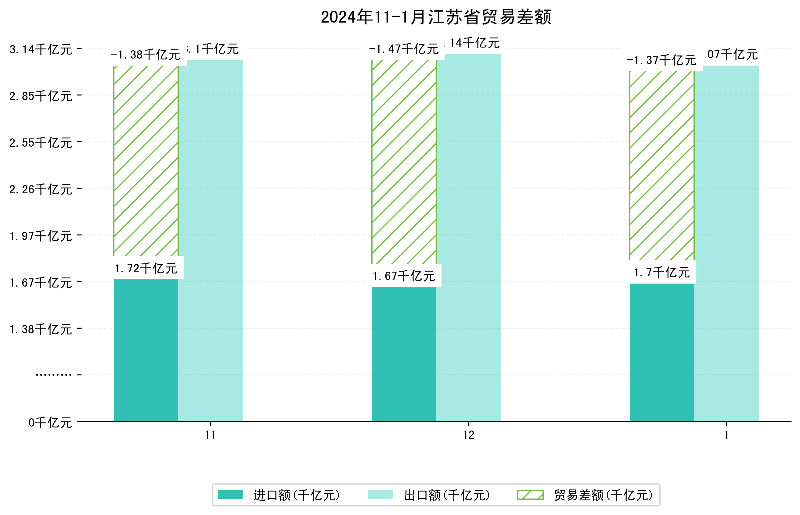 以人民币计,2024年1月江苏省贸易差额为1373,5953,3197万元(贸易顺差),相比上月减少了95,8081,1287万元,即11,7349,5682万美元;相比上年同期增加了14,9403,2460万元,同比增加1.1%。