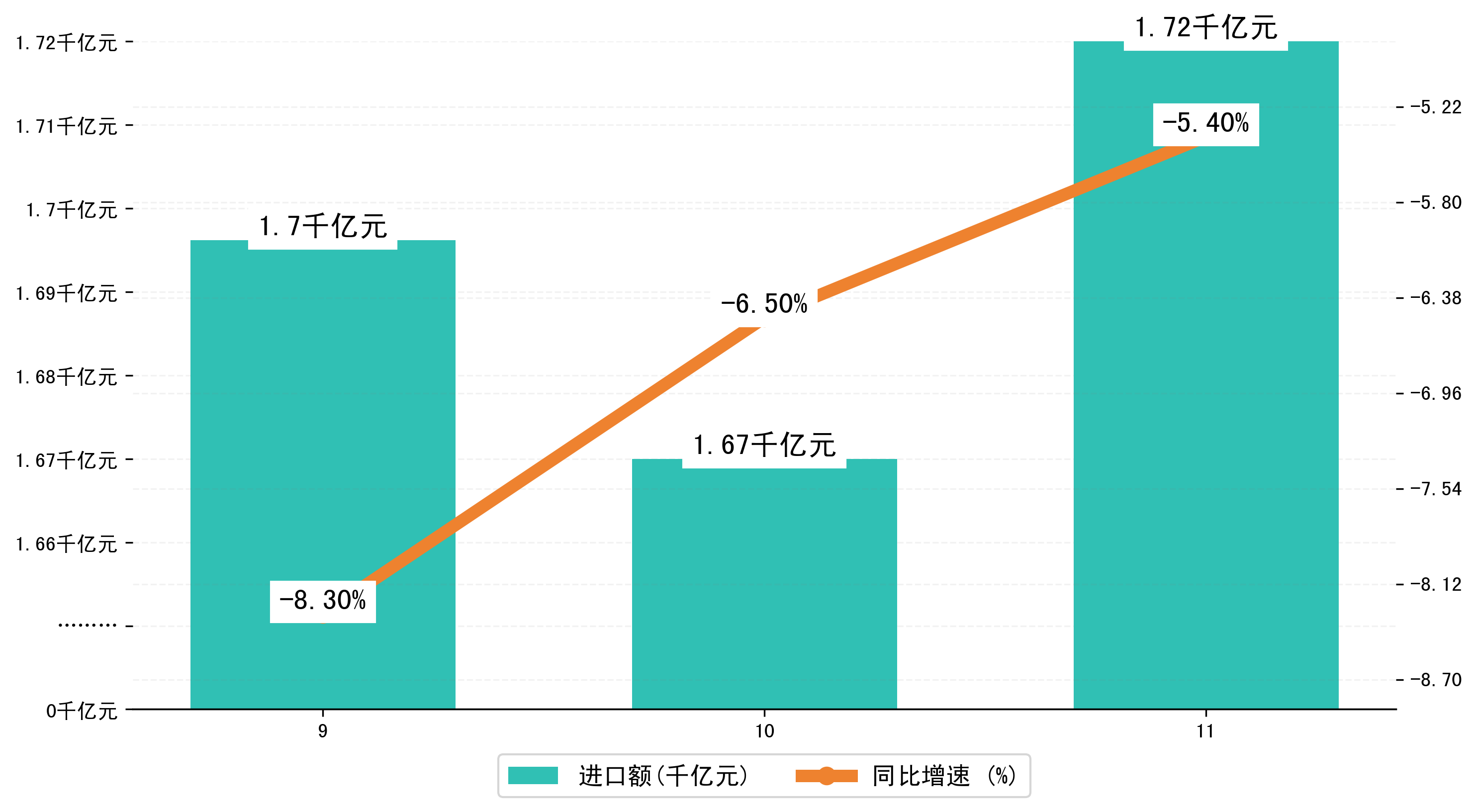 以人民币计,2023年11月江苏省进口额为1721,7211.2193万元,相比上月增加了51,4683.934万元;相比上年同期增加了95,8659.8801万元,同比减少了-5.40%。