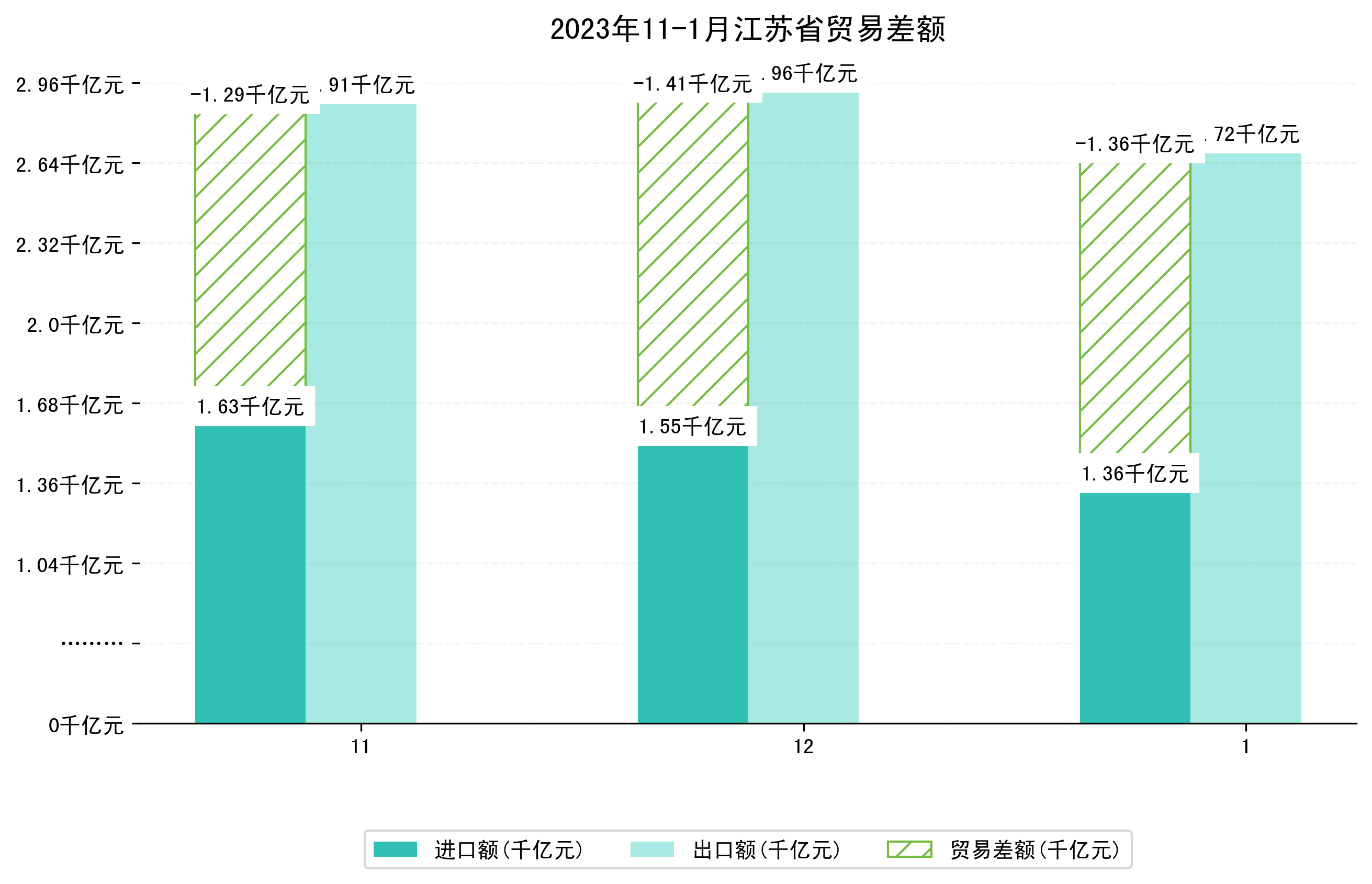 以美元计,2023年1-1月江苏省贸易差额为194,7761,5903万美元(贸易顺差),相比上年同期增加了10,3576,0430万美元,同比增加5.62%。