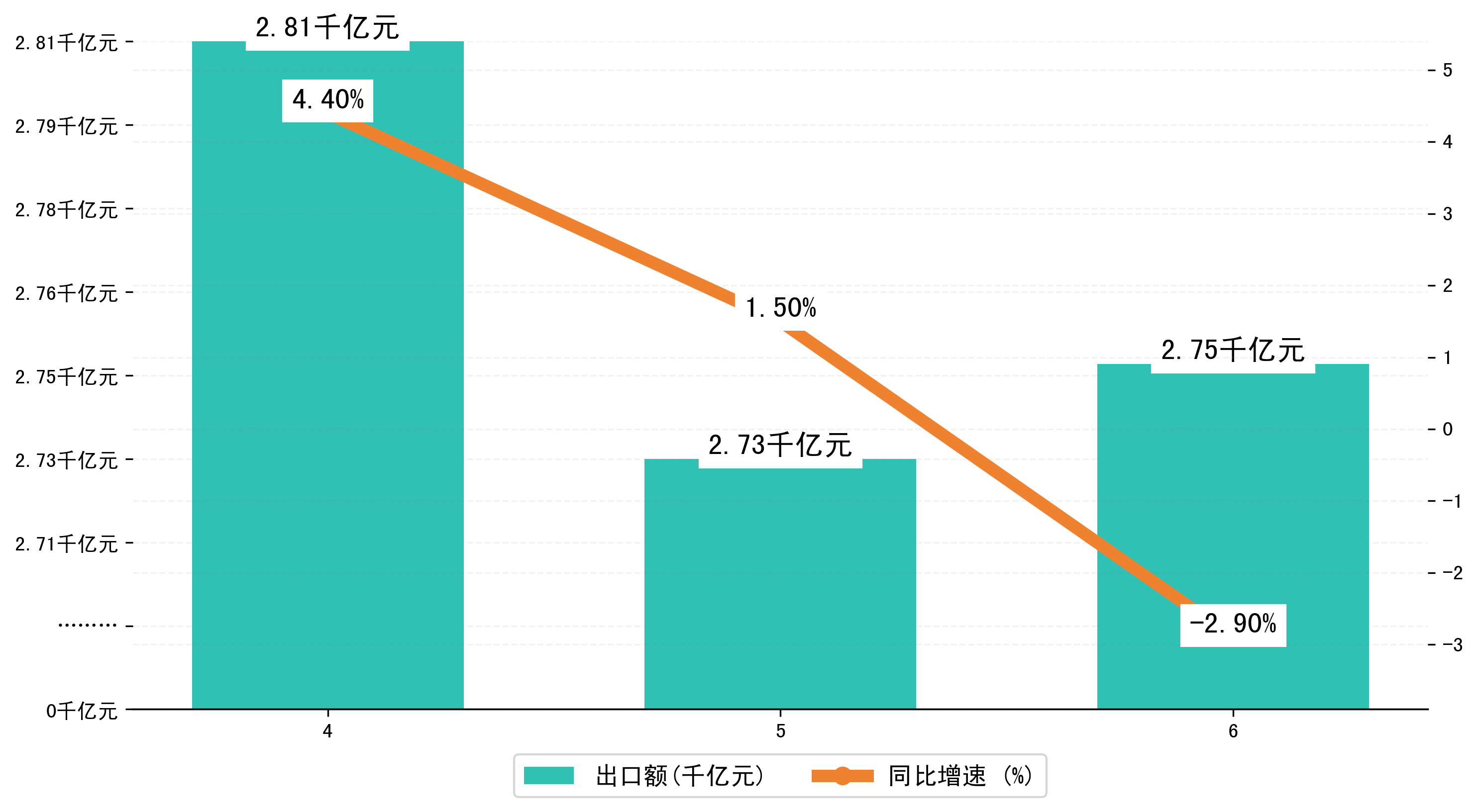以人民币计,2023年6月江苏省出口额为2748,3409.1939万元,相比上月增加了17,8122.8262万元;相比上年同期减少了683,6871.2363万元,同比减少了-2.90%。