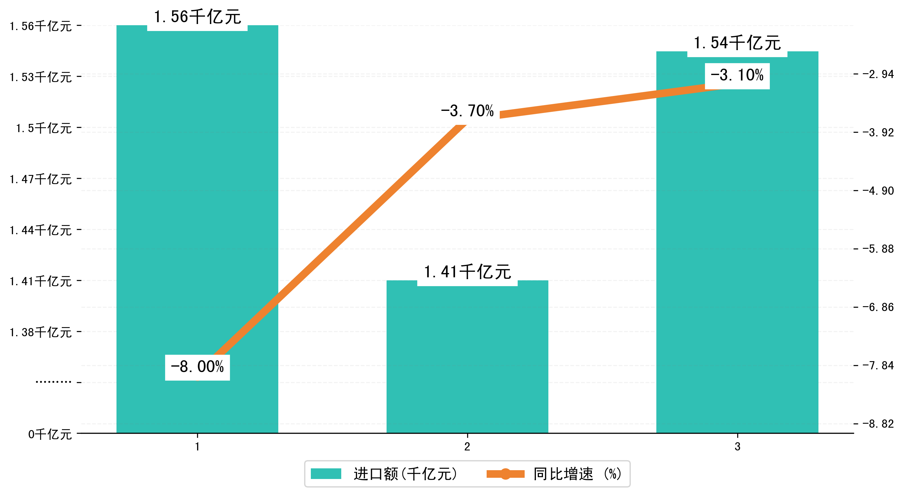 以人民币计,2025年3月江苏省进口额为1543,8010.1878万元,相比上月增加了132,6330.8389万元;相比上年同期减少了47,0892.1366万元,同比减少了-3.10%。