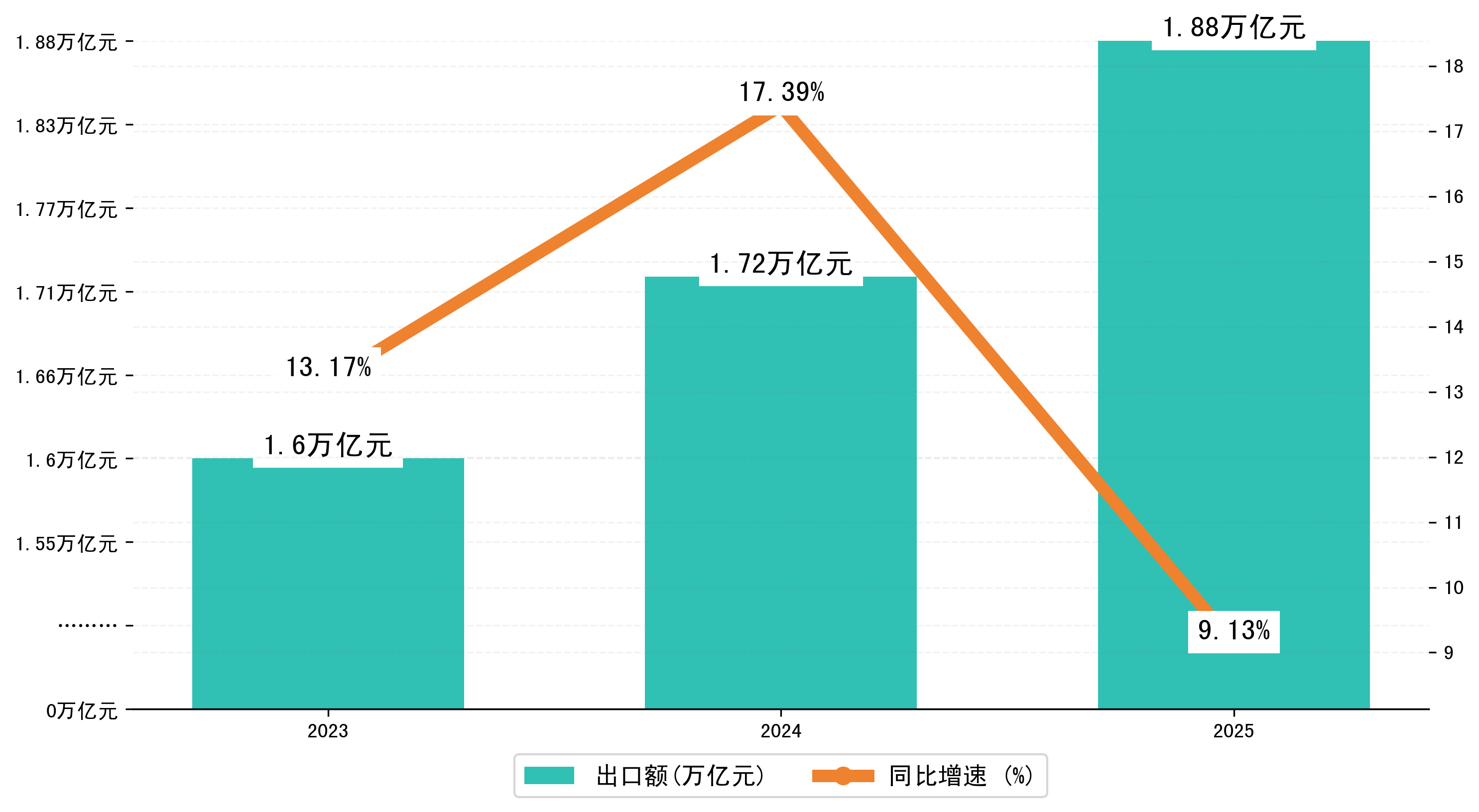 以人民币计,2025年1-6月江苏省出口额为1,8809,1380.6388万元,相比上年同期增加了1573,0546.38万元,同比增加了9.40%。