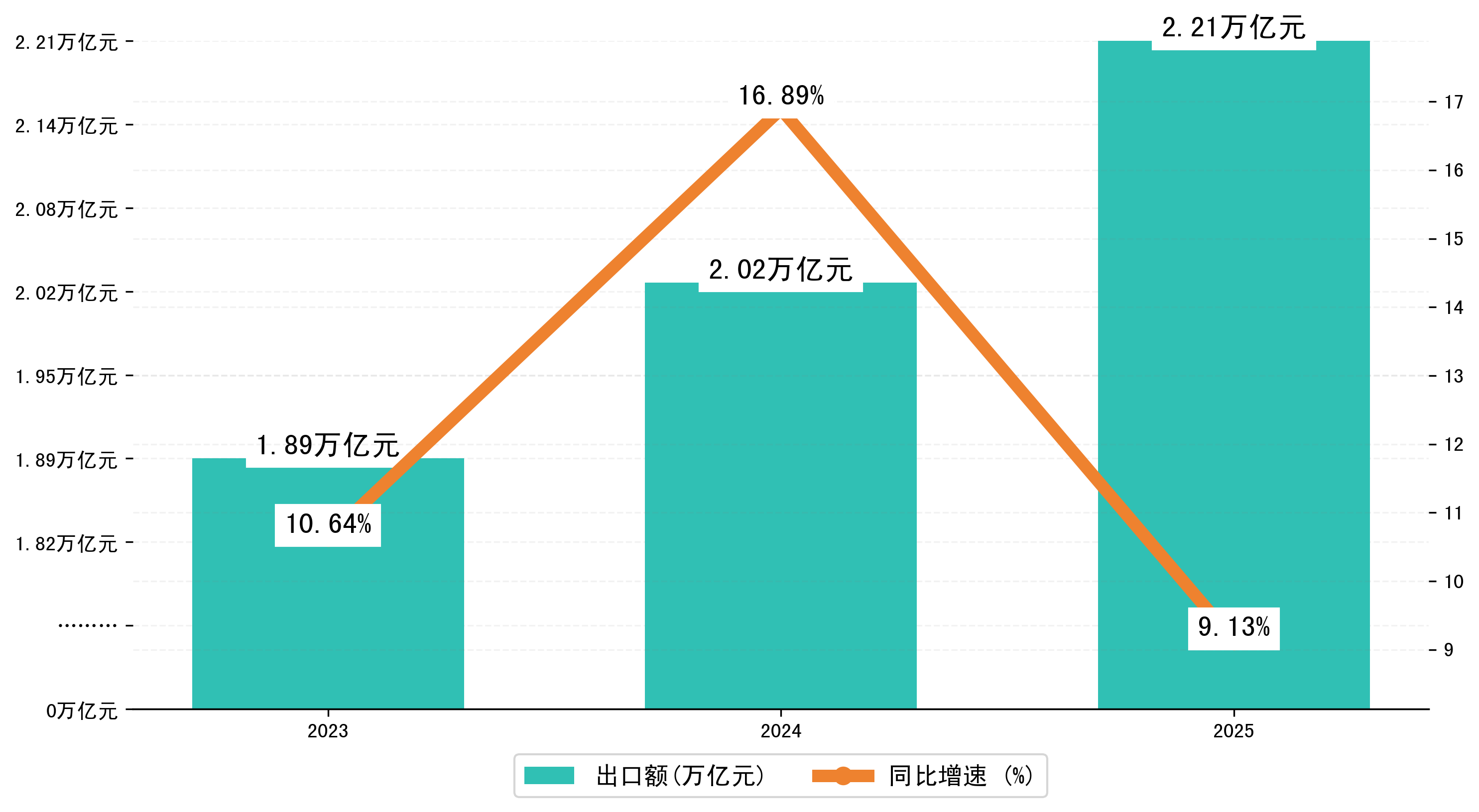 以人民币计,2025年1-7月江苏省出口额为2,2068,8230.9274万元,相比上年同期增加了1846,5265.1214万元,同比增加了9.30%。