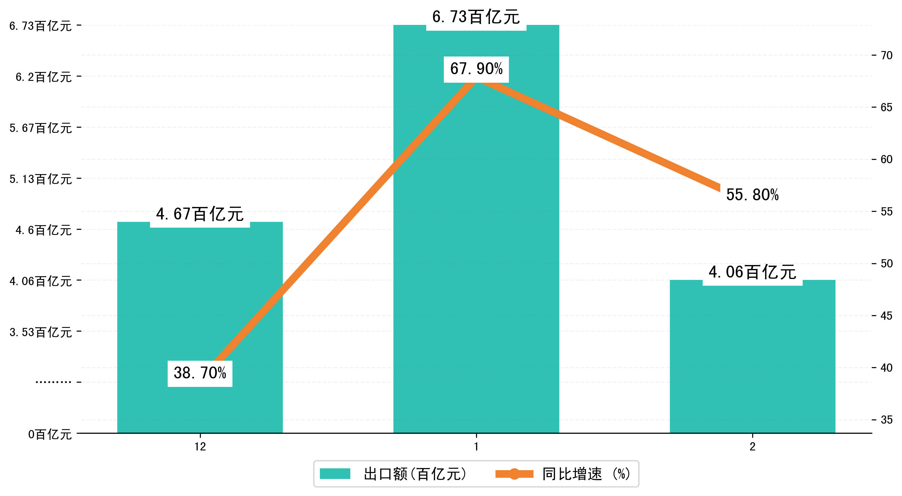 以美元计,2023年1-2月江西省出口额为156,4112.8714万美元,相比上年同期增加了46,5060.5703万美元,同比增加43.80%。