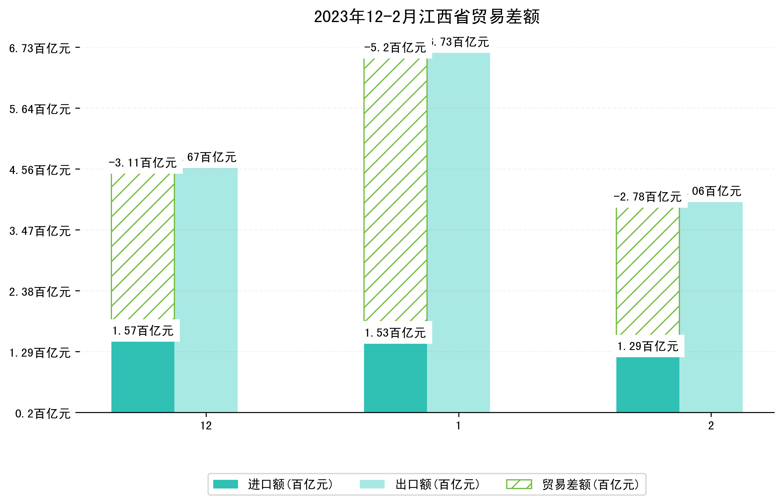 以美元计,2023年1-2月江西省贸易差额为115,5003,7847万美元(贸易顺差),相比上年同期增加了41,9092,6634万美元,同比增加56.95%。