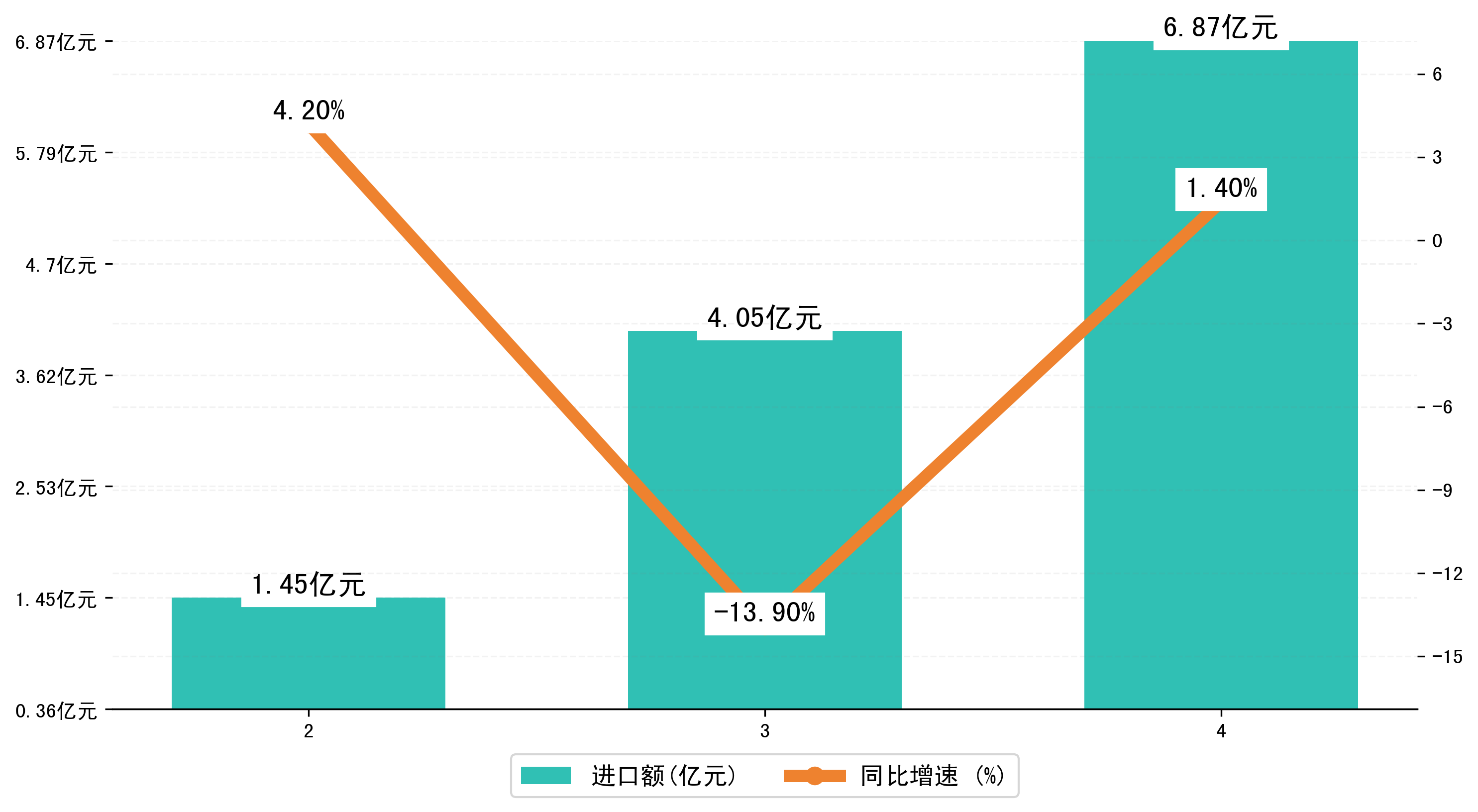 以人民币计,2024年1-4月茂名市进口额为19,5287.5997万元,相比上年同期增加了8031.8292万元,同比增加了1.40%。