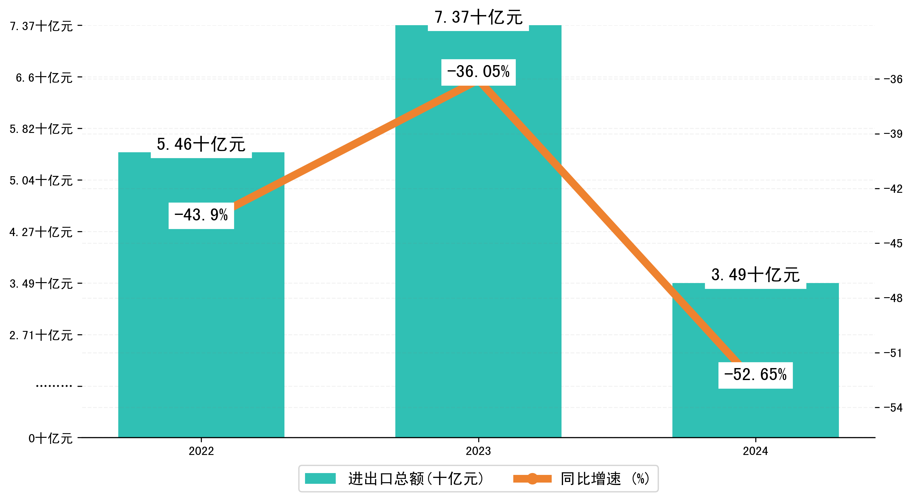 以人民币计,2024年4月茂名市进出口总额为11,3991.6453万元,相比上月增加了4,0597.2804万元;相比上年同期减少了12,4214.6604万元,同比减少了-2.30%。