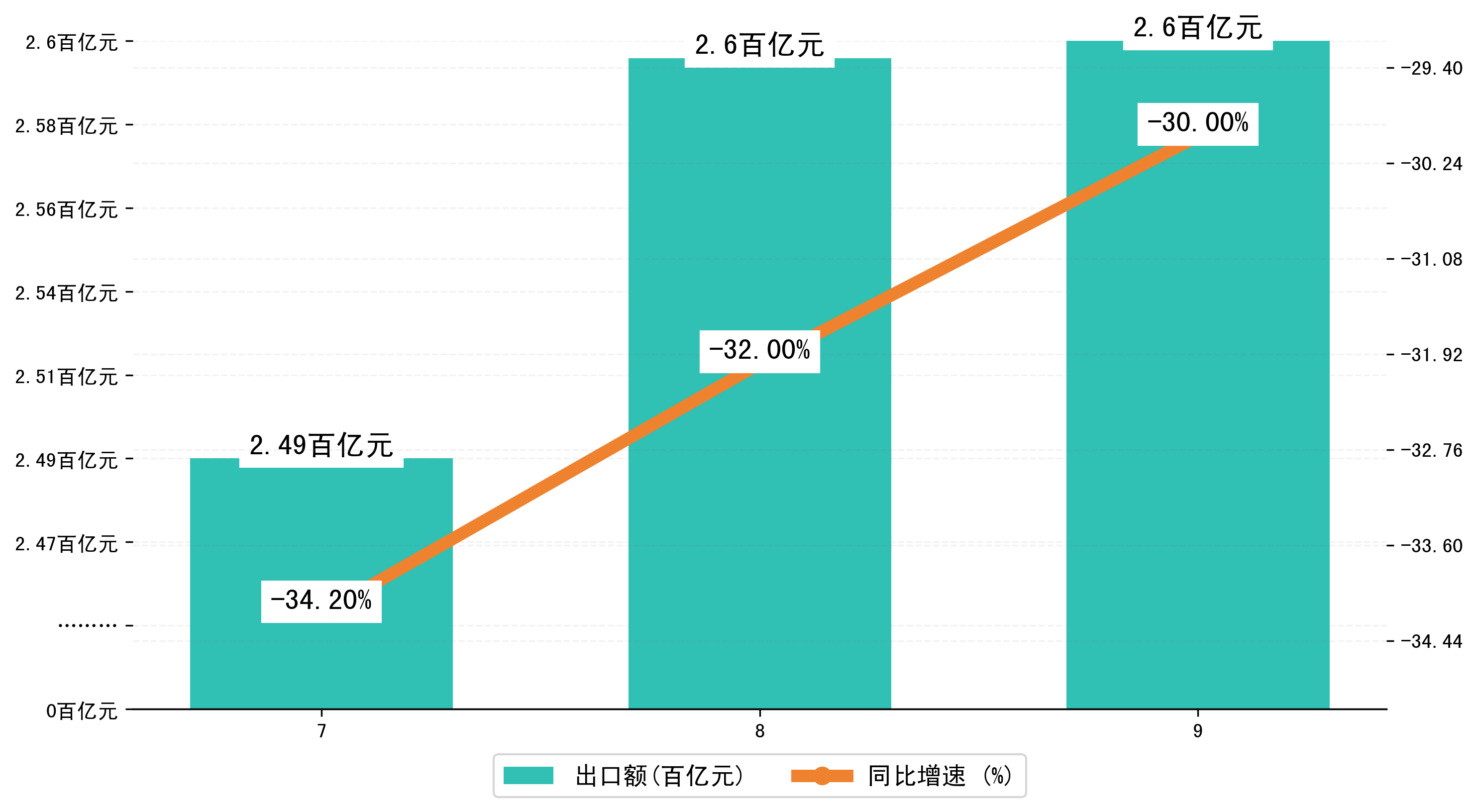 以人民币计,2024年9月江西省出口额为260,2373.9006万元,相比上月增加了4639.6268万元;相比上年同期减少了30,4497.7765万元,同比减少了-30.00%。