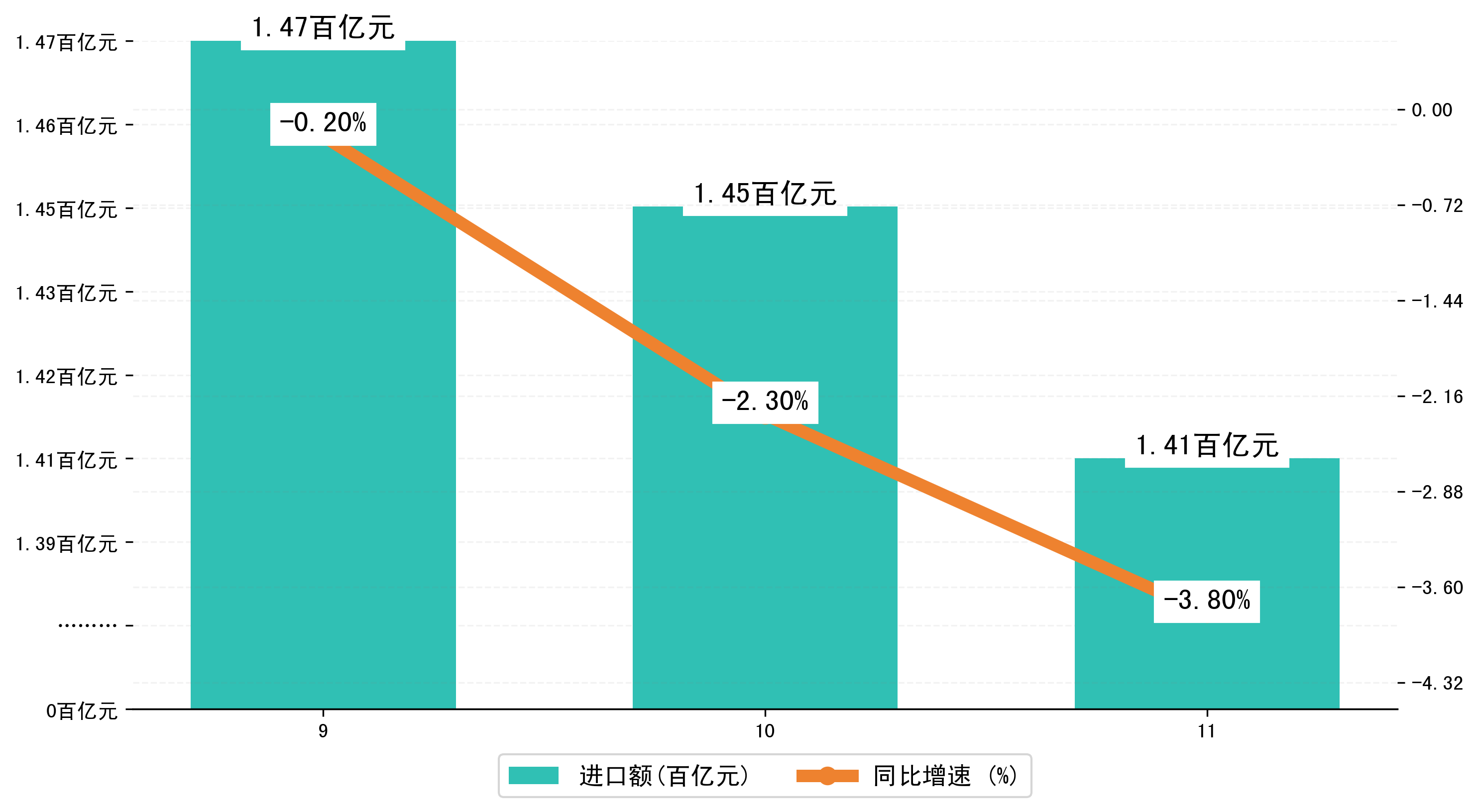 以人民币计,2024年11月江西省进口额为140,6162.9671万元,相比上月减少了4,1406.8596万元;相比上年同期减少了31,1411.4413万元,同比减少了-3.80%。