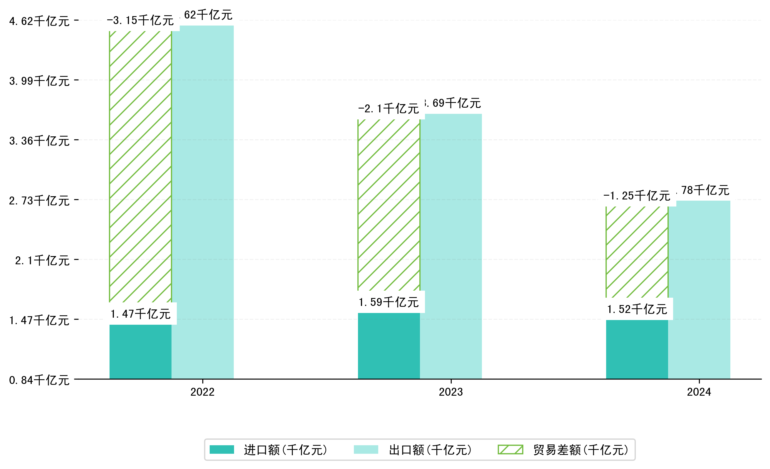 以人民币计,2024年1-11月江西省贸易差额为1254,7876,0876万元(贸易顺差),相比上年同期减少了843,0862,6916万元,同比减少-40.19%。