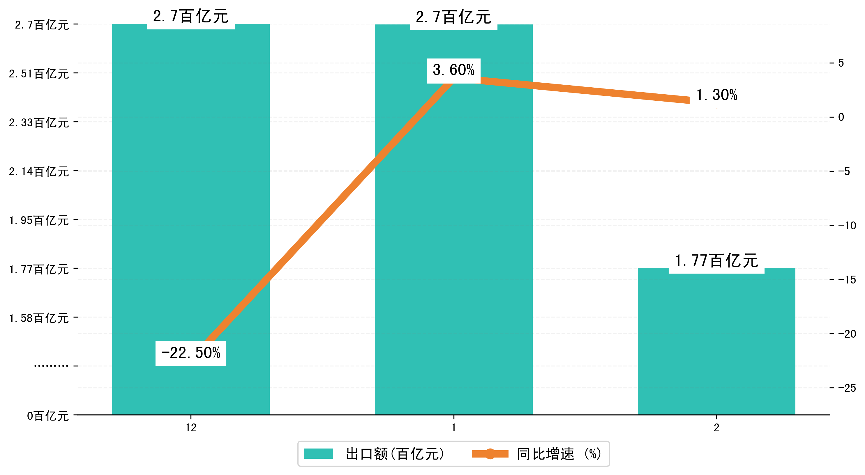 以美元计,2025年1-2月江西省出口额为62,1078.5085万美元,相比上年同期增加了543.8663万美元,同比增加0.20%。