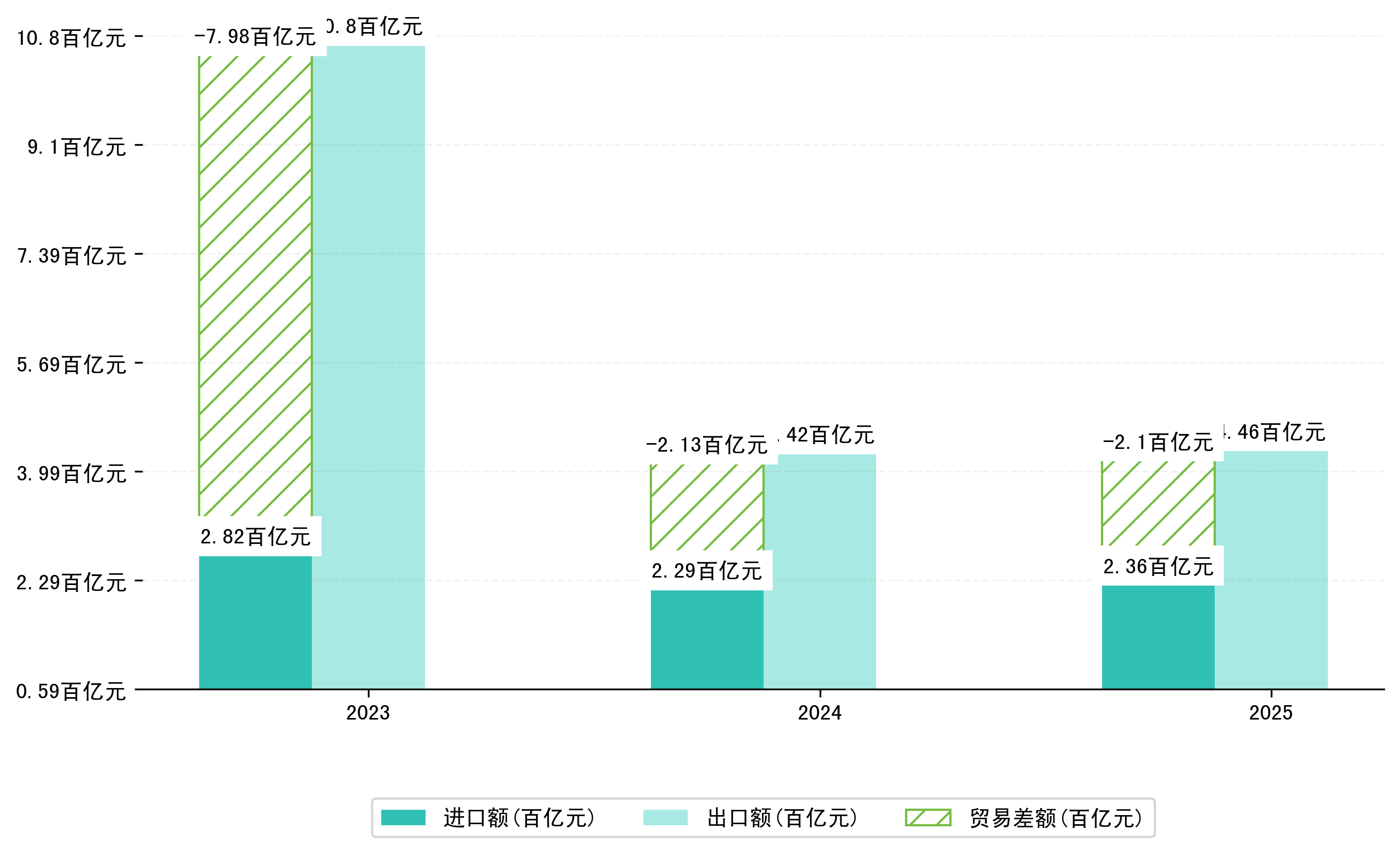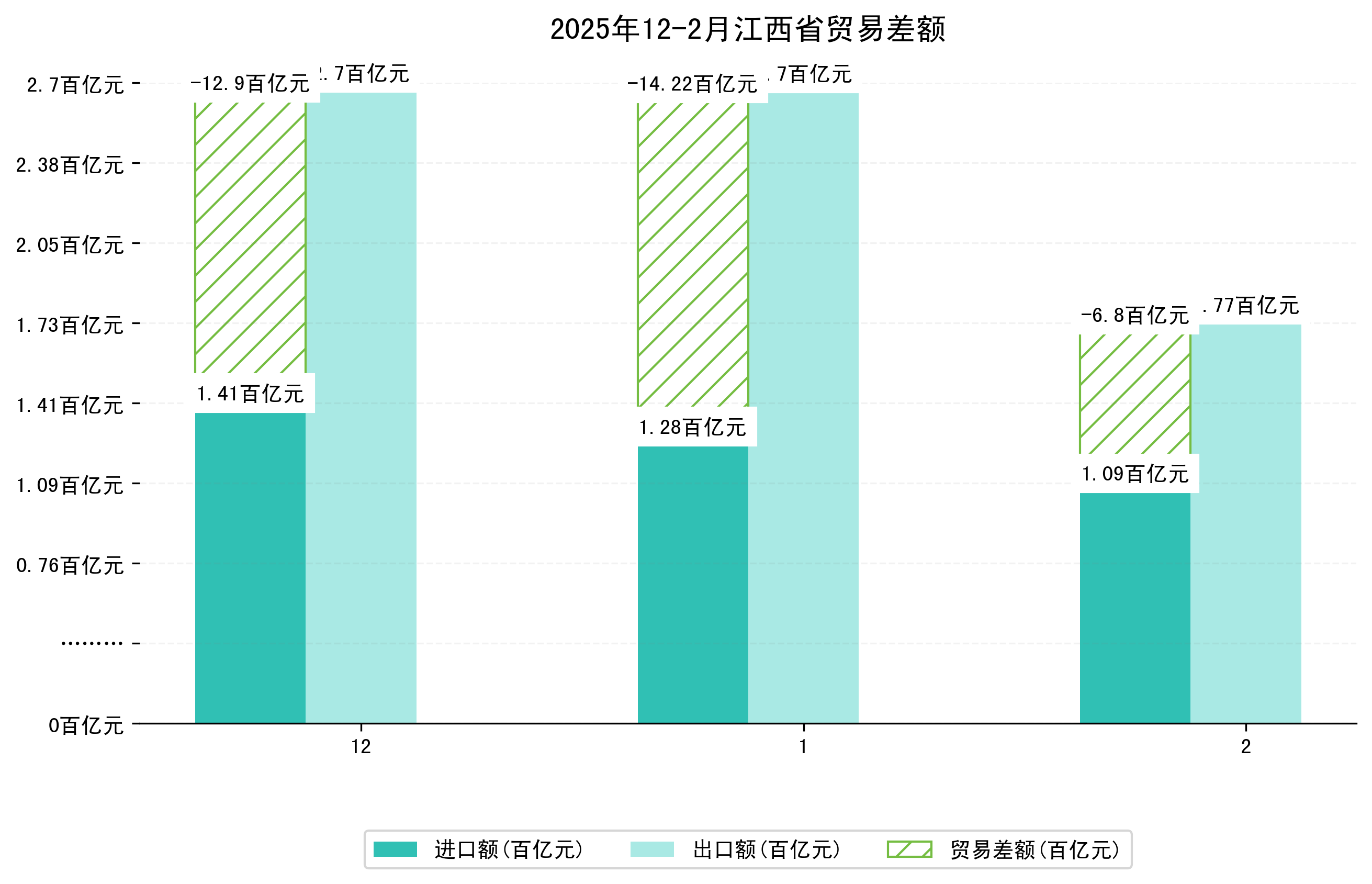 以人民币计,2025年1-2月江西省贸易差额为210,1800,4115万元(贸易顺差),相比上年同期减少了2,7765,6436万元,同比减少-1.3%。