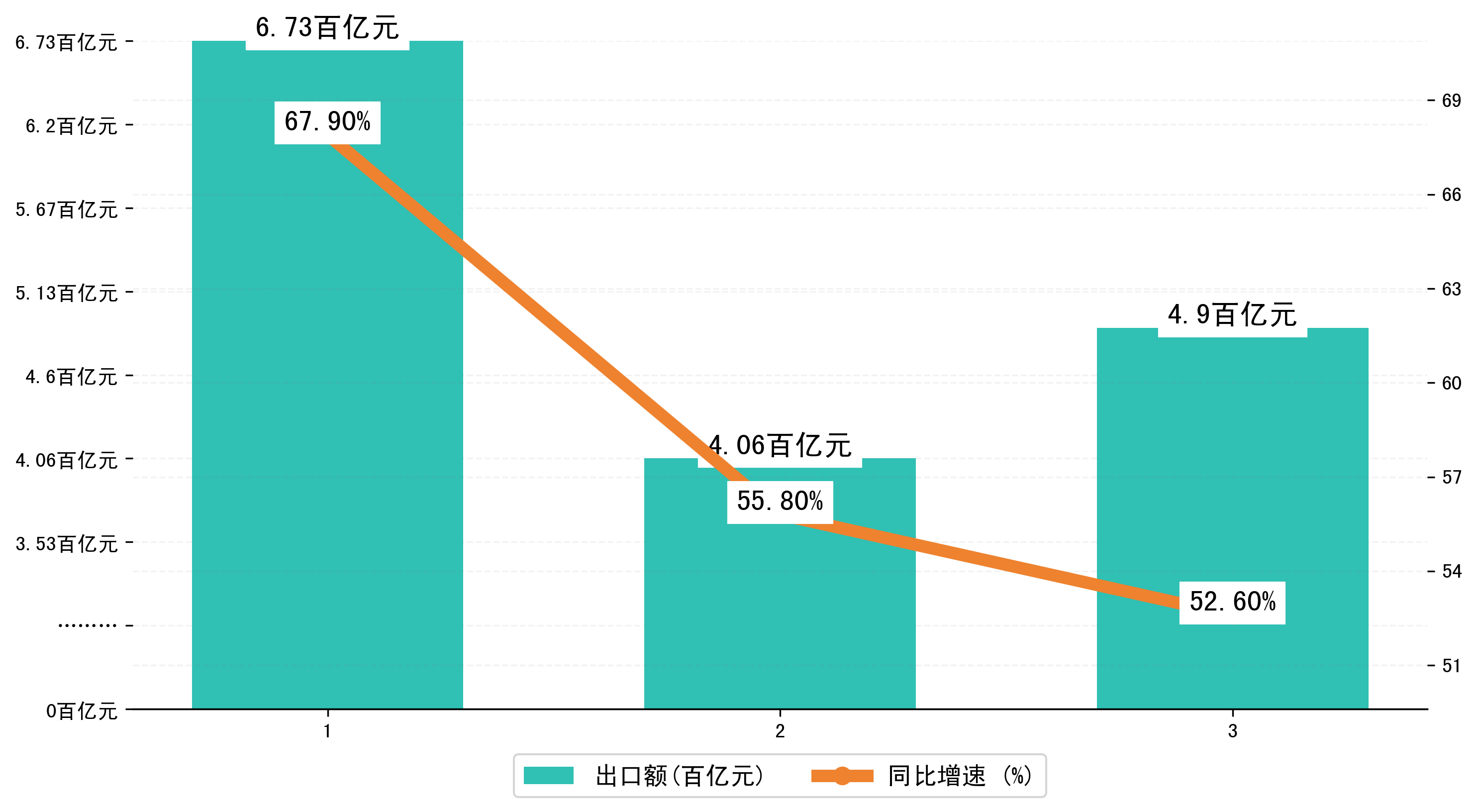 以美元计,2023年1-3月江西省出口额为228,1913.165万美元,相比上年同期增加了64,2072.1271万美元,同比增加41.20%。
