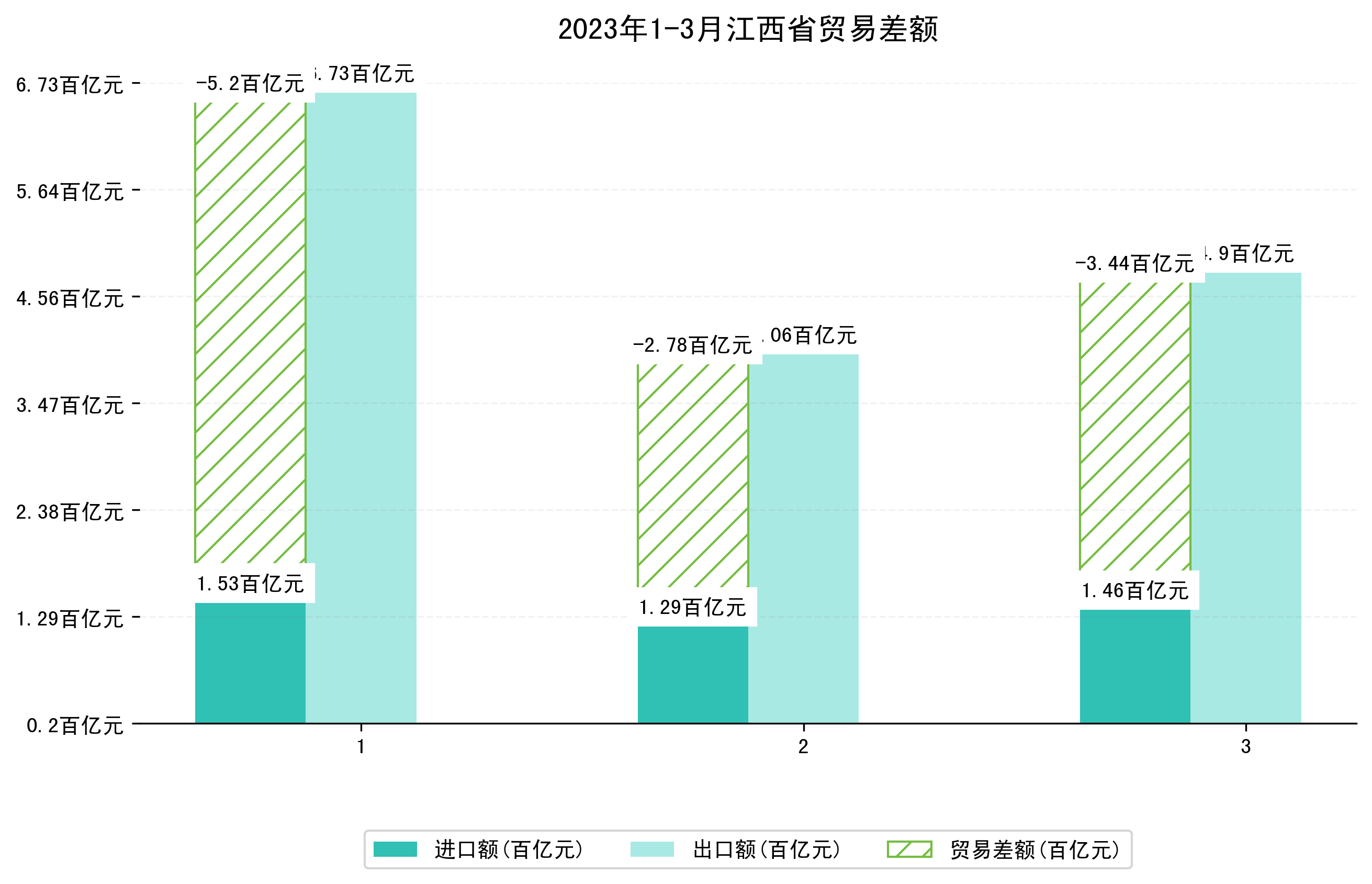 以人民币计,2023年3月江西省贸易差额为344,0026,8324万元(贸易顺差),相比上月增加了66,4340,6689万元,即9,4040,2565万美元;相比上年同期增加了118,2783,7362万元,同比增加52.4%。