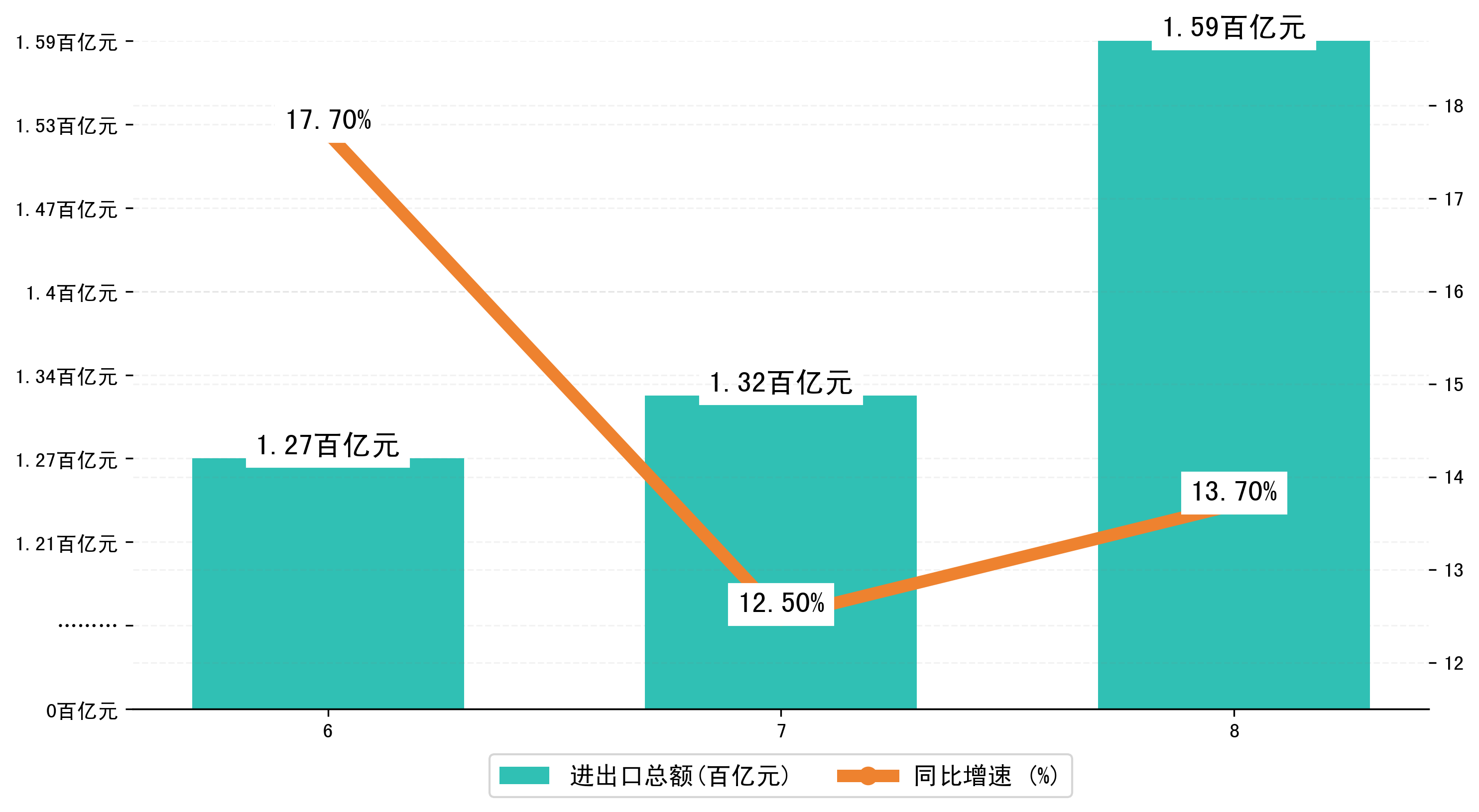 以人民币计,2024年1-8月吉林省进出口总额为1165,3357.8515万元,相比上年同期增加了139,7494.6099万元,同比增加了13.70%。