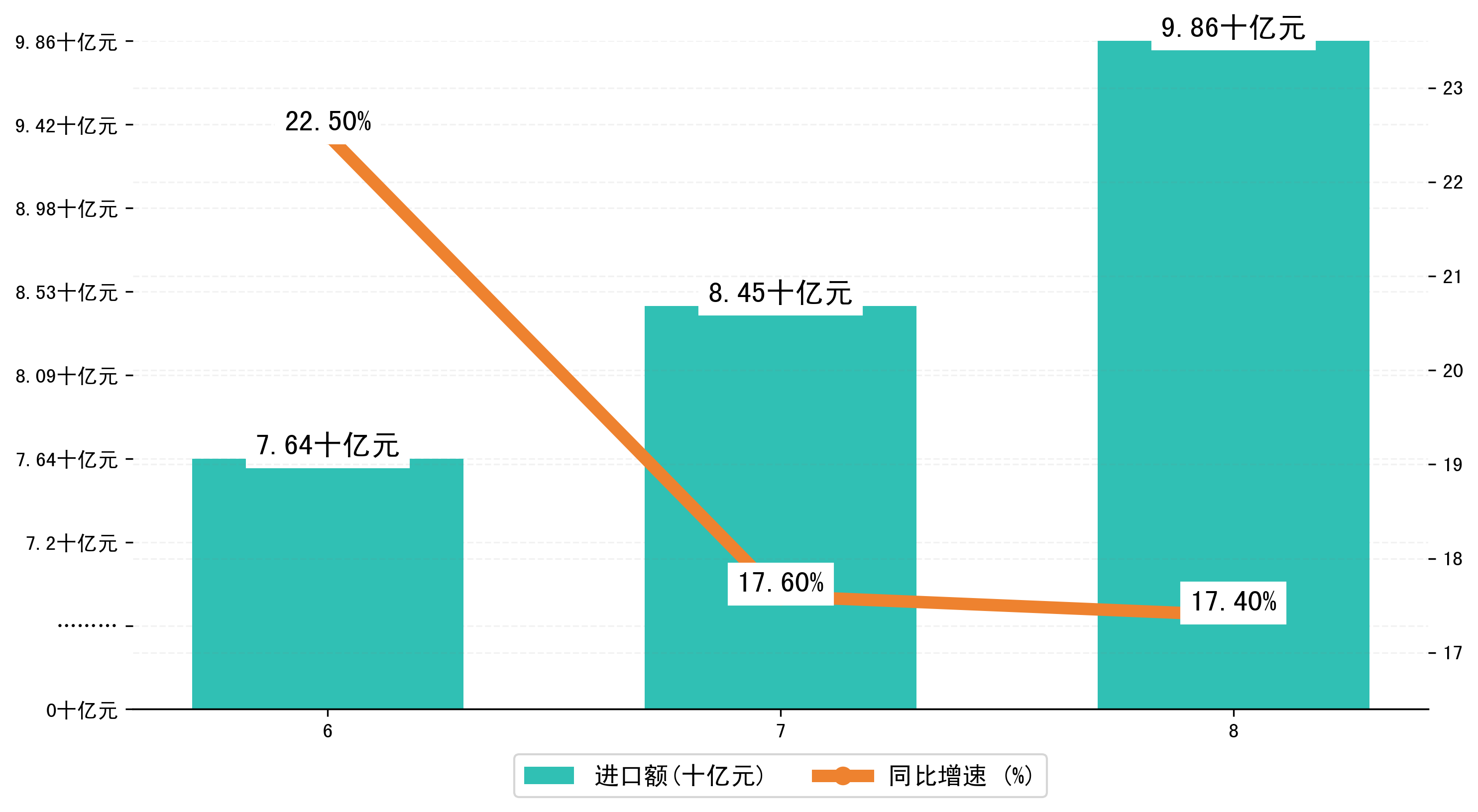 以人民币计,2024年8月吉林省进口额为98,6344.3151万元,相比上月增加了14,1100.6204万元;相比上年同期增加了12,8264.0296万元,同比增加了17.40%。