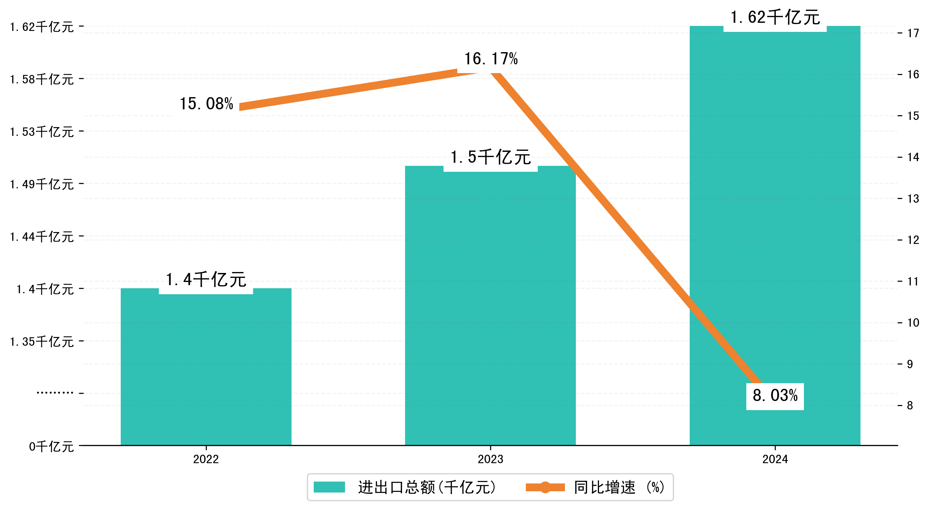 以人民币计,2024年1-11月吉林省进出口总额为1622,6139.8069万元,相比上年同期增加了120,5704.9925万元,同比增加了8.10%。