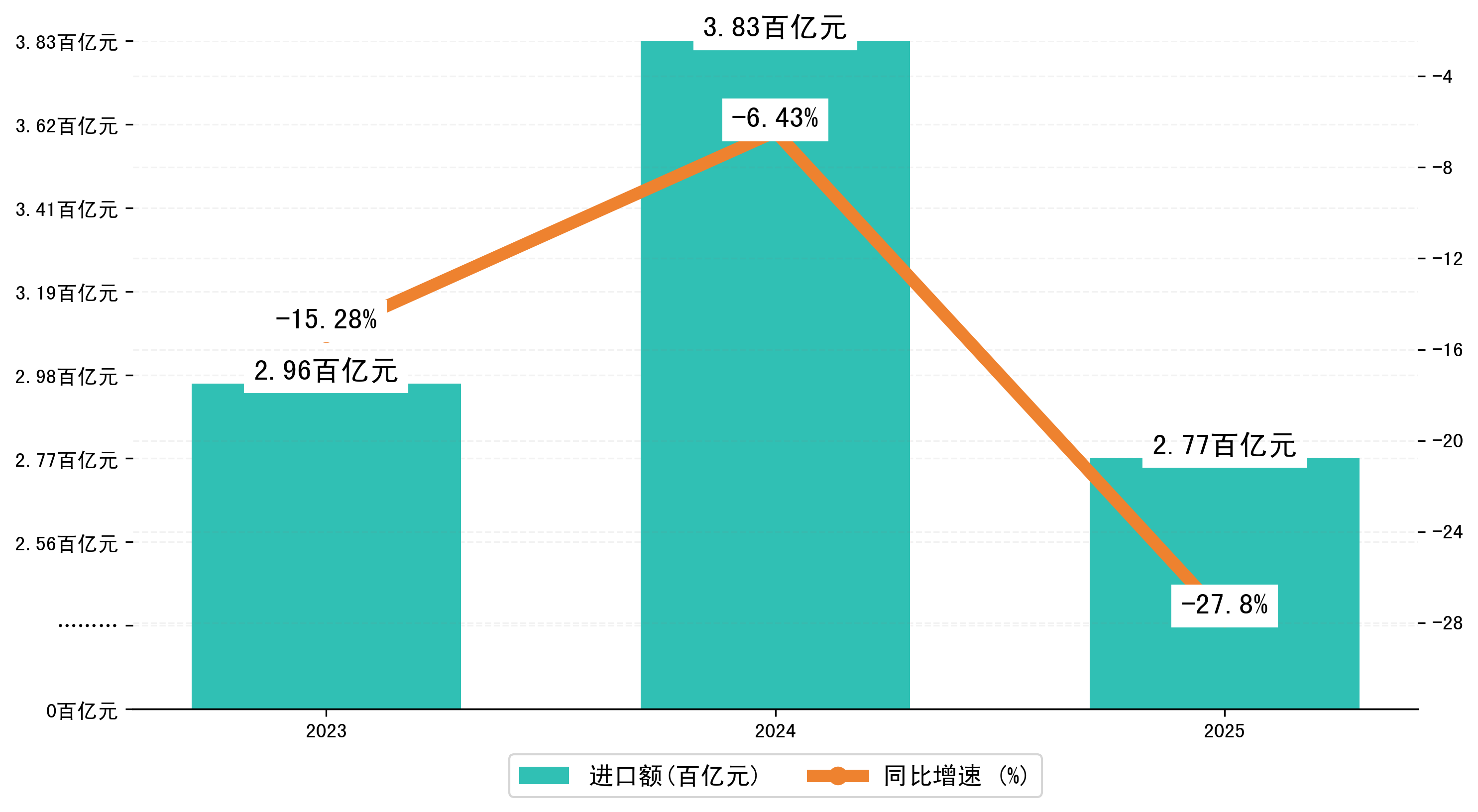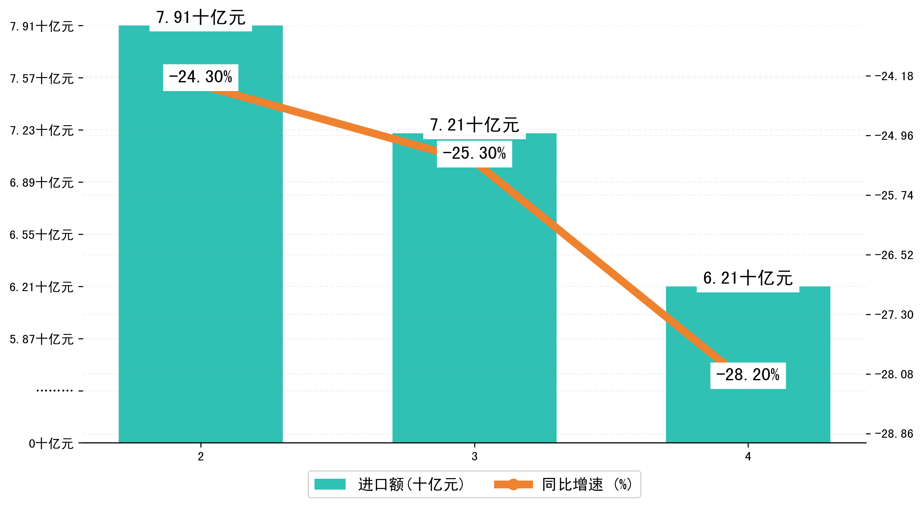以人民币计,2025年1-4月吉林省进口额为276,8147.1632万元,相比上年同期减少了106,5589.6869万元,同比减少了-28.20%。