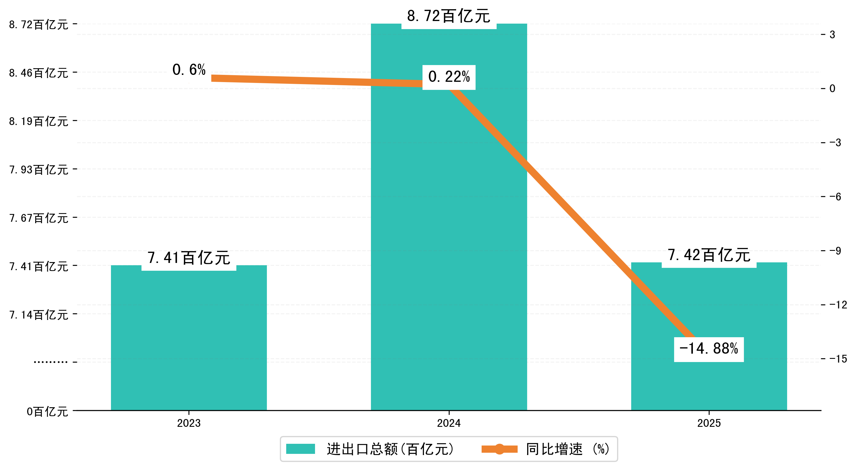 以人民币计,2025年1-6月吉林省进出口总额为742,2021.7485万元,相比上年同期减少了129,7625.907万元,同比减少了-15.10%。