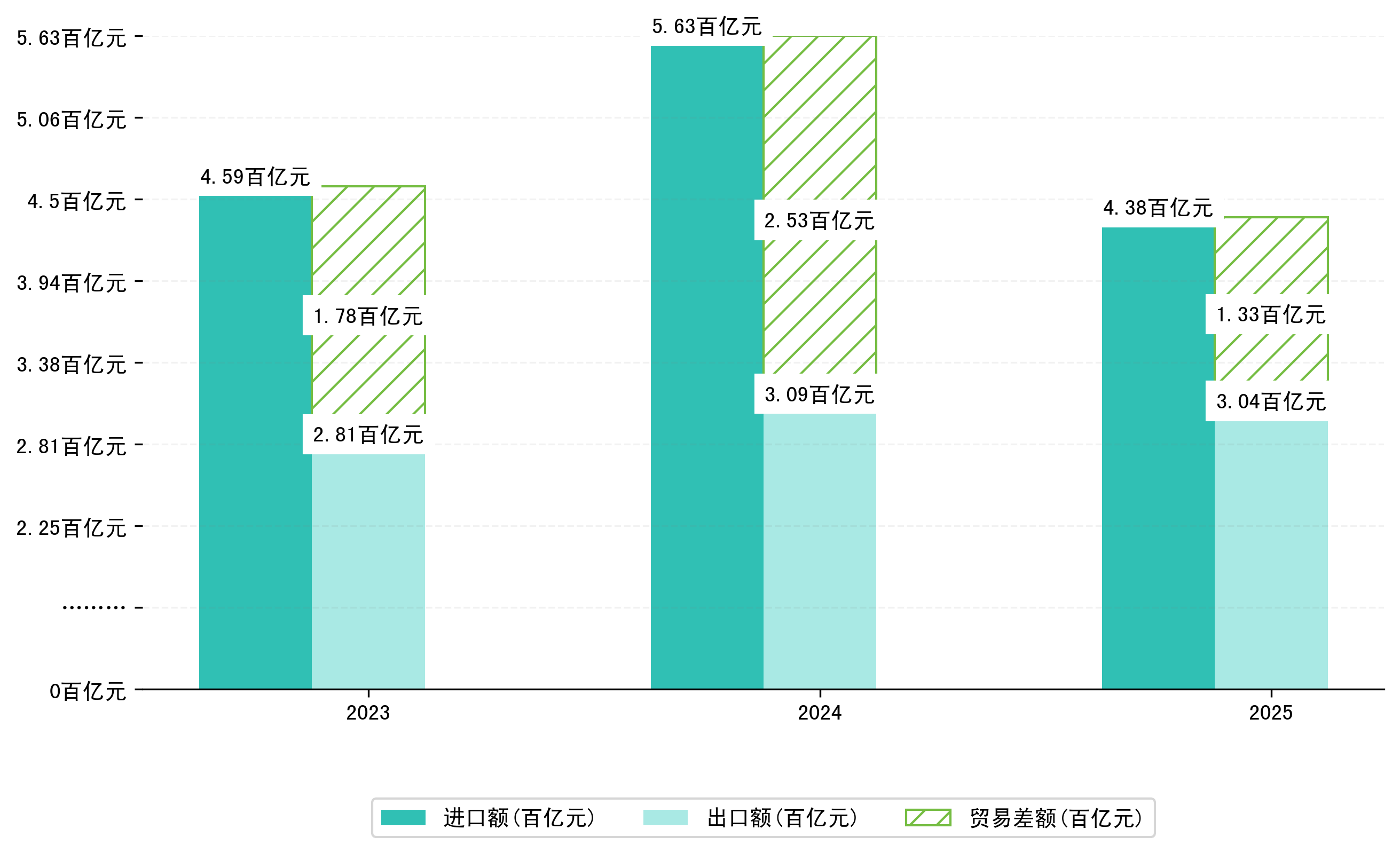 以人民币计,2025年1-6月吉林省贸易差额为133,4551,9343万元(贸易逆差),相比上年同期增加了120,0059,2418万元,同比增加-47.35%。