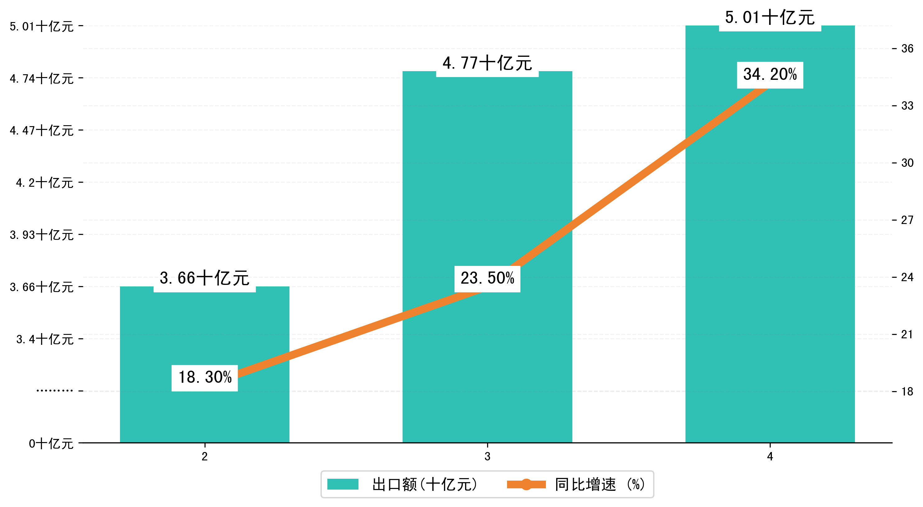 以人民币计,2023年4月吉林省出口额为50,1059.2242万元,相比上月增加了2,3603.7124万元;相比上年同期增加了21,0523.8741万元,同比增加了34.20%。