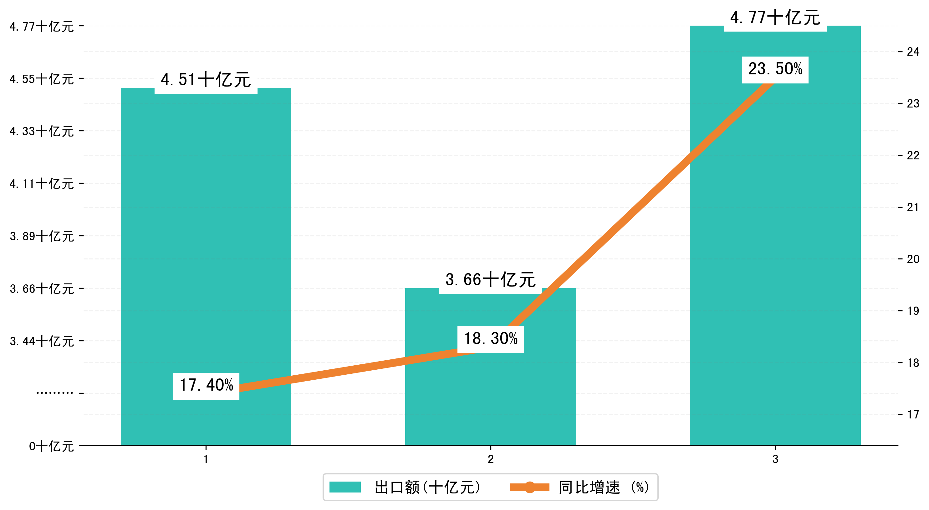 以人民币计,2023年3月吉林省出口额为47,7455.5118万元,相比上月增加了11,0969.042万元;相比上年同期增加了11,3625.1572万元,同比增加了23.50%。
