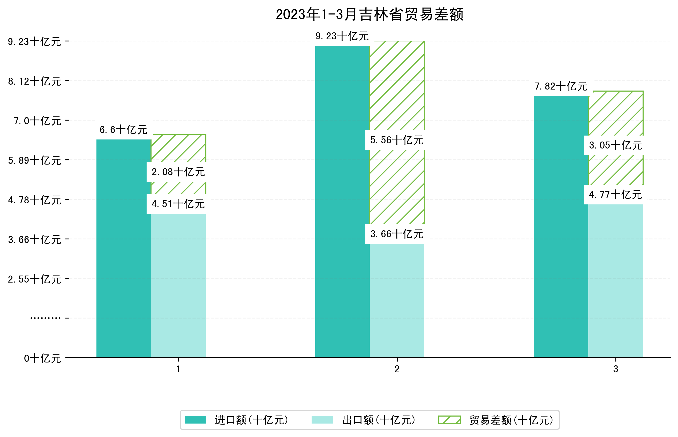 以人民币计,2023年3月吉林省贸易差额为30,4770,4403万元(贸易逆差),相比上月增加了25,1588,0314万元,即3,5912,8963万美元;相比上年同期减少了2,9513,6776万元,同比减少10.72%。