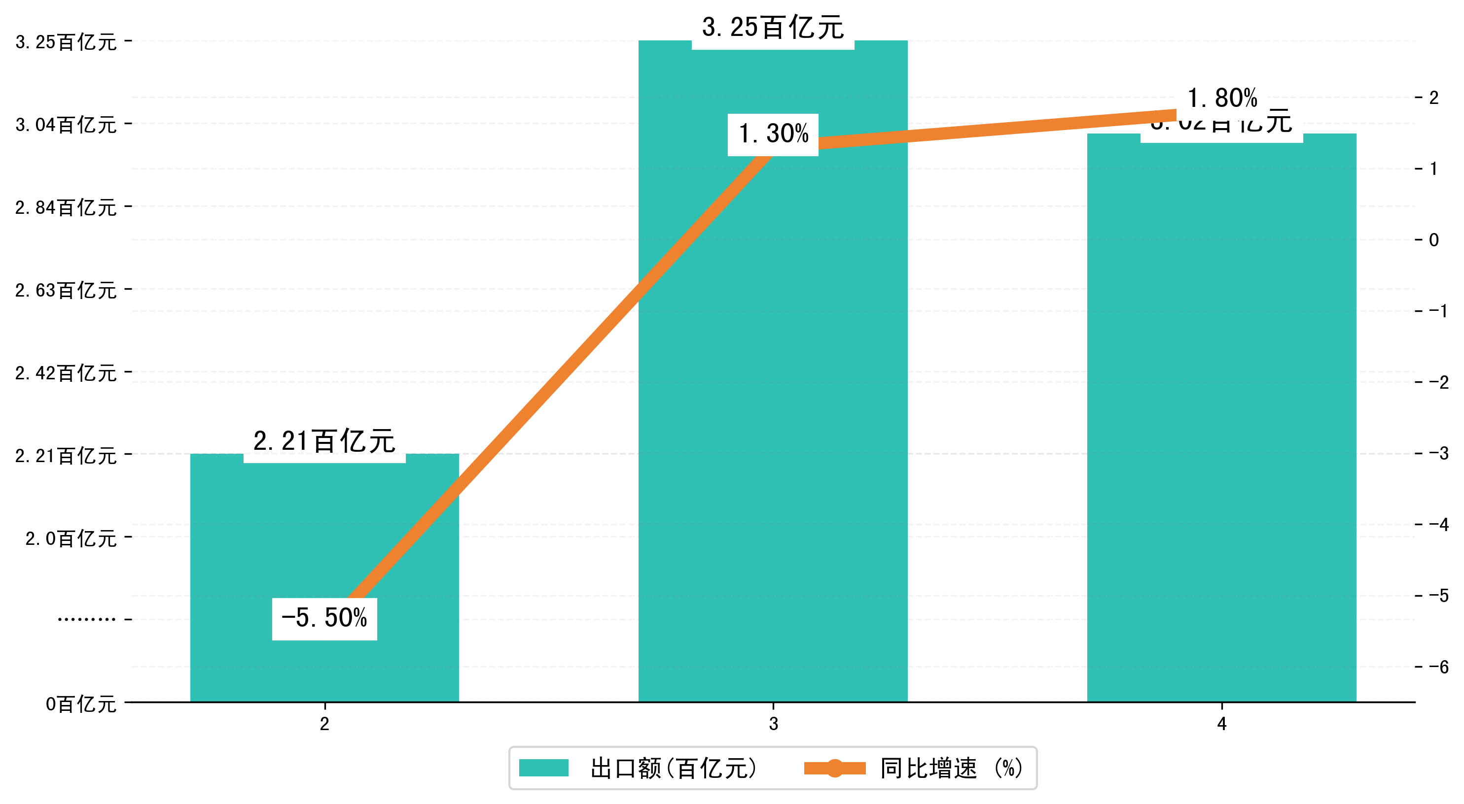 以美元计,2024年1-4月辽宁省出口额为164,1530.4841万美元,相比上年同期增加了3,8518.8193万美元,同比增加-1.40%。