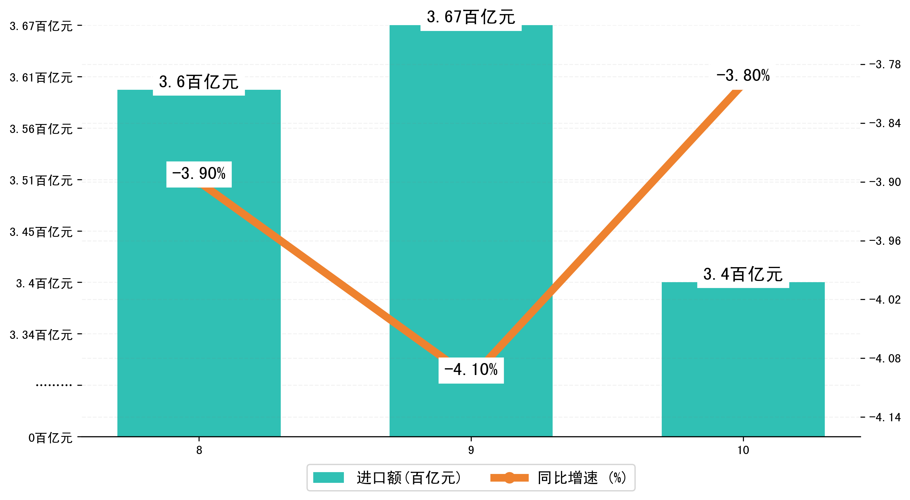 以人民币计,2023年10月辽宁省进口额为339,8202.0718万元,相比上月减少了26,9589.6763万元;相比上年同期减少了7,6266.2378万元,同比减少了-3.80%。