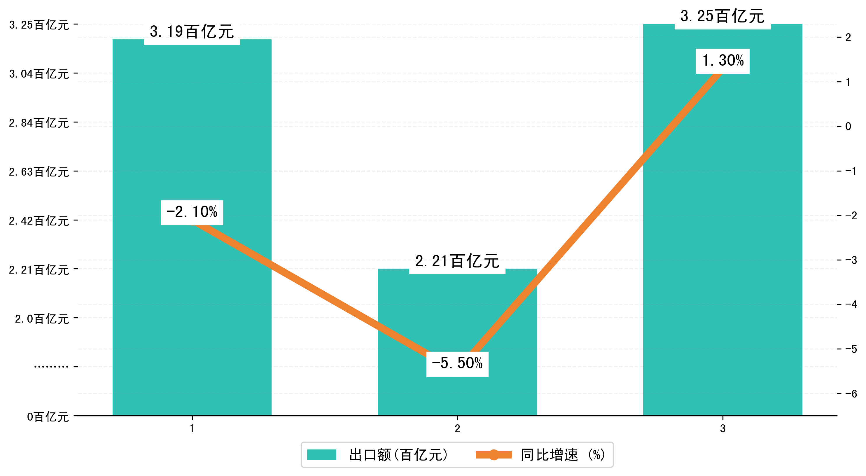 以美元计,2024年1-3月辽宁省出口额为121,7531.6962万美元,相比上年同期增加了3,2797.4746万美元,同比增加-1.80%。