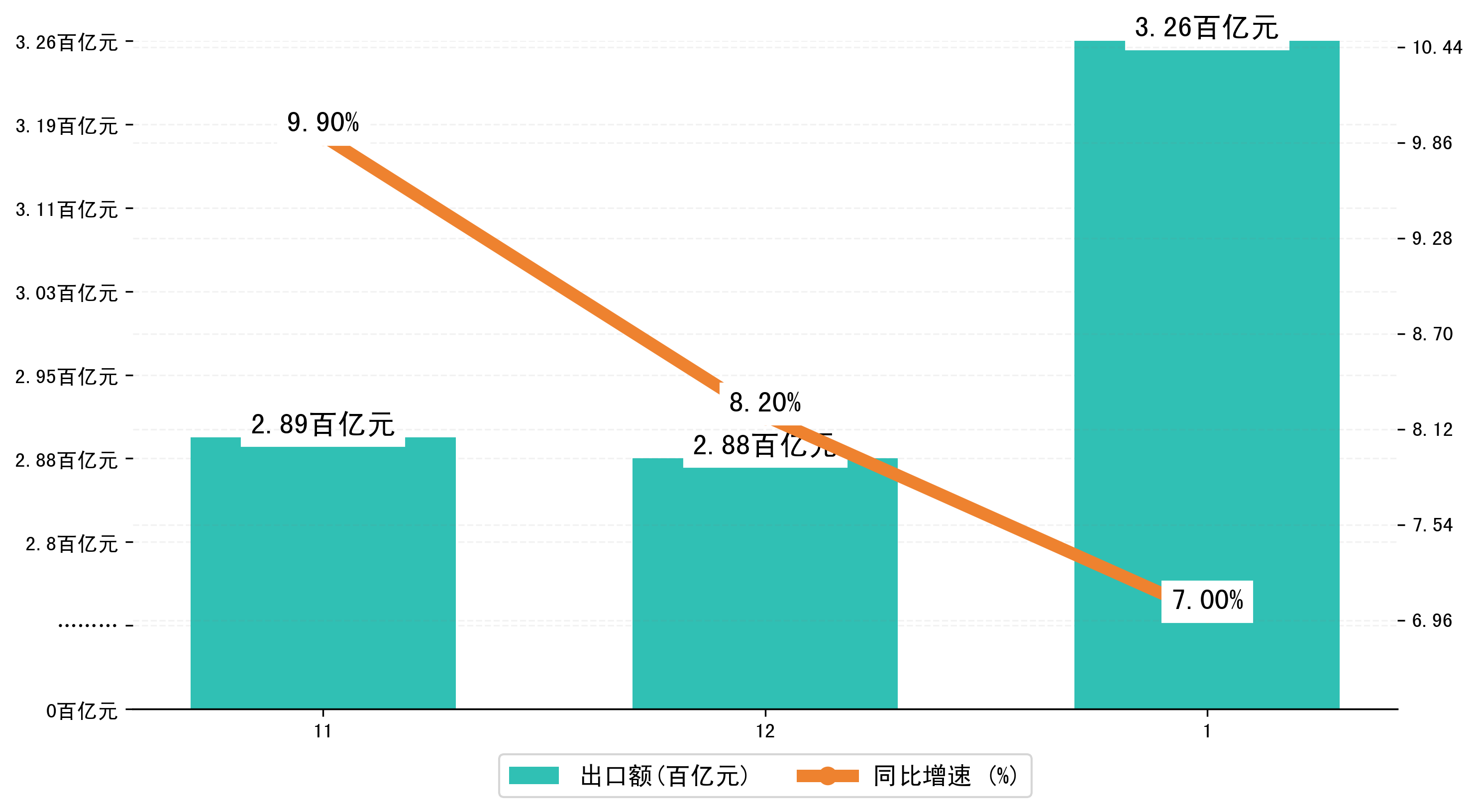 以人民币计,2023年1-1月辽宁省出口额为326,2495.2933万元,相比上年同期增加了21,4229.5925万元,同比增加了7.00%。