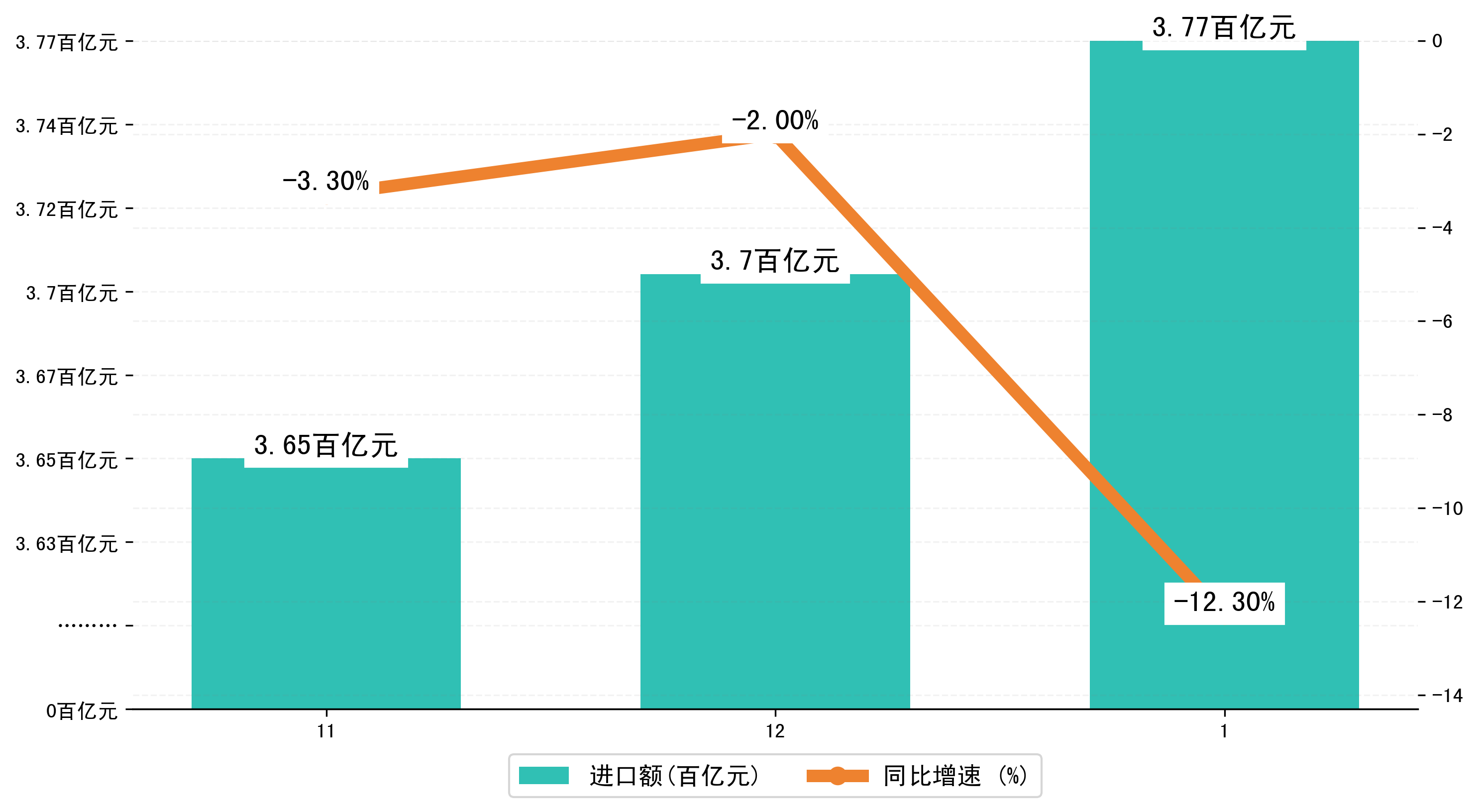 以人民币计,2023年1月辽宁省进口额为376,7025.4729万元,相比上月增加了6,5005.8159万元;相比上年同期减少了47,1448.2856万元,同比减少了-12.30%。