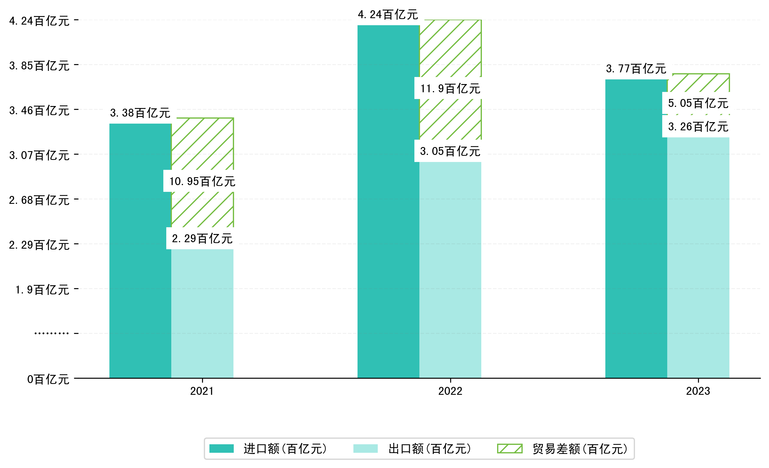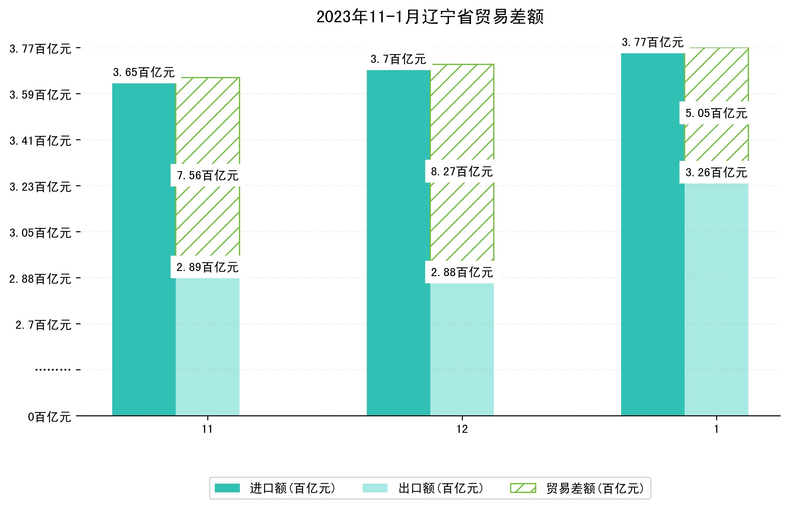 以人民币计,2023年1月辽宁省贸易差额为50,4530,1796万元(贸易逆差),相比上月增加了32,2209,4941万元,即4,4503,5646万美元;相比上年同期增加了68,5677,8781万元,同比增加-57.61%。