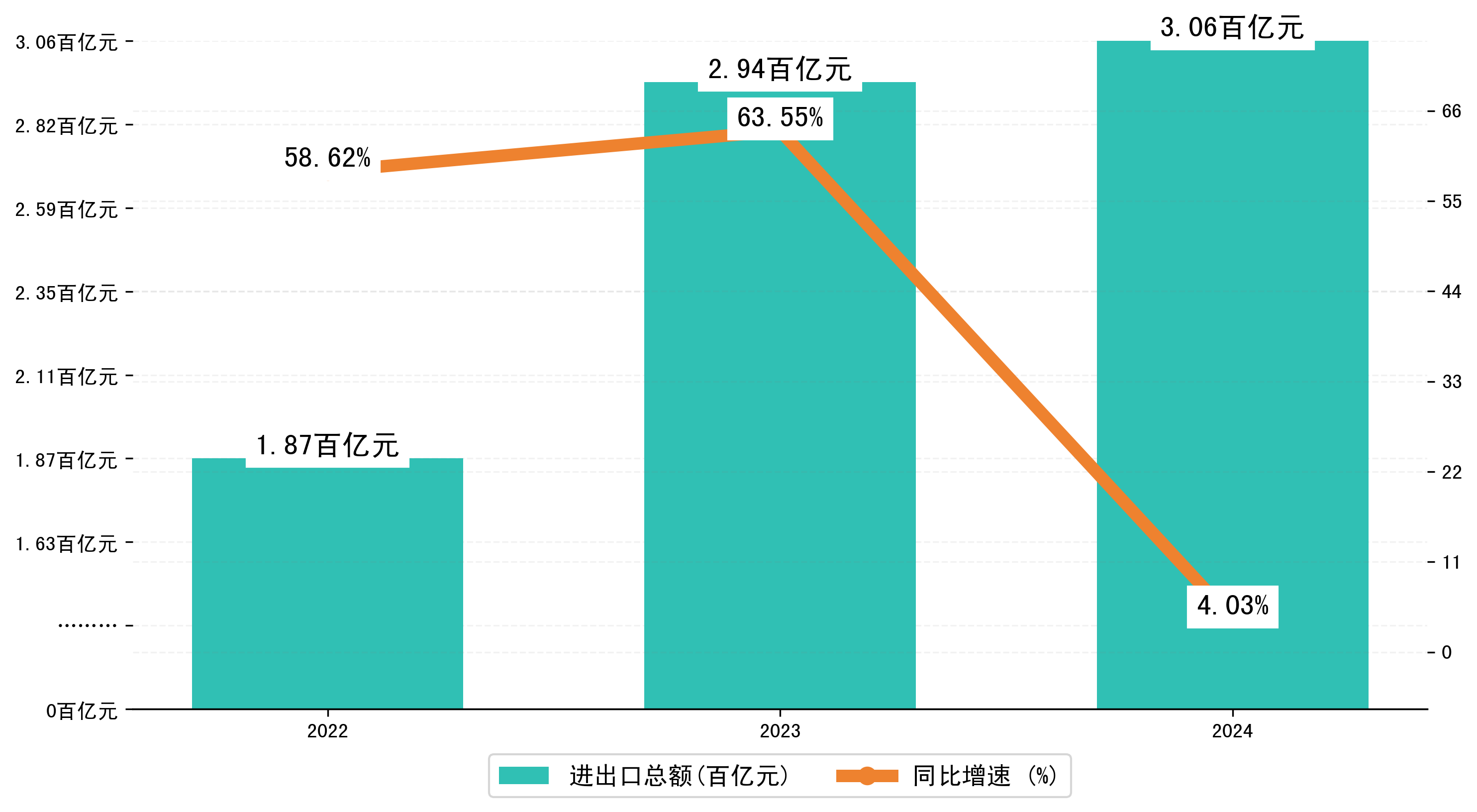 以人民币计,2024年1-2月内蒙古自治区进出口总额为306,2262.3856万元,相比上年同期增加了11,8581.6261万元,同比增加了3.80%。