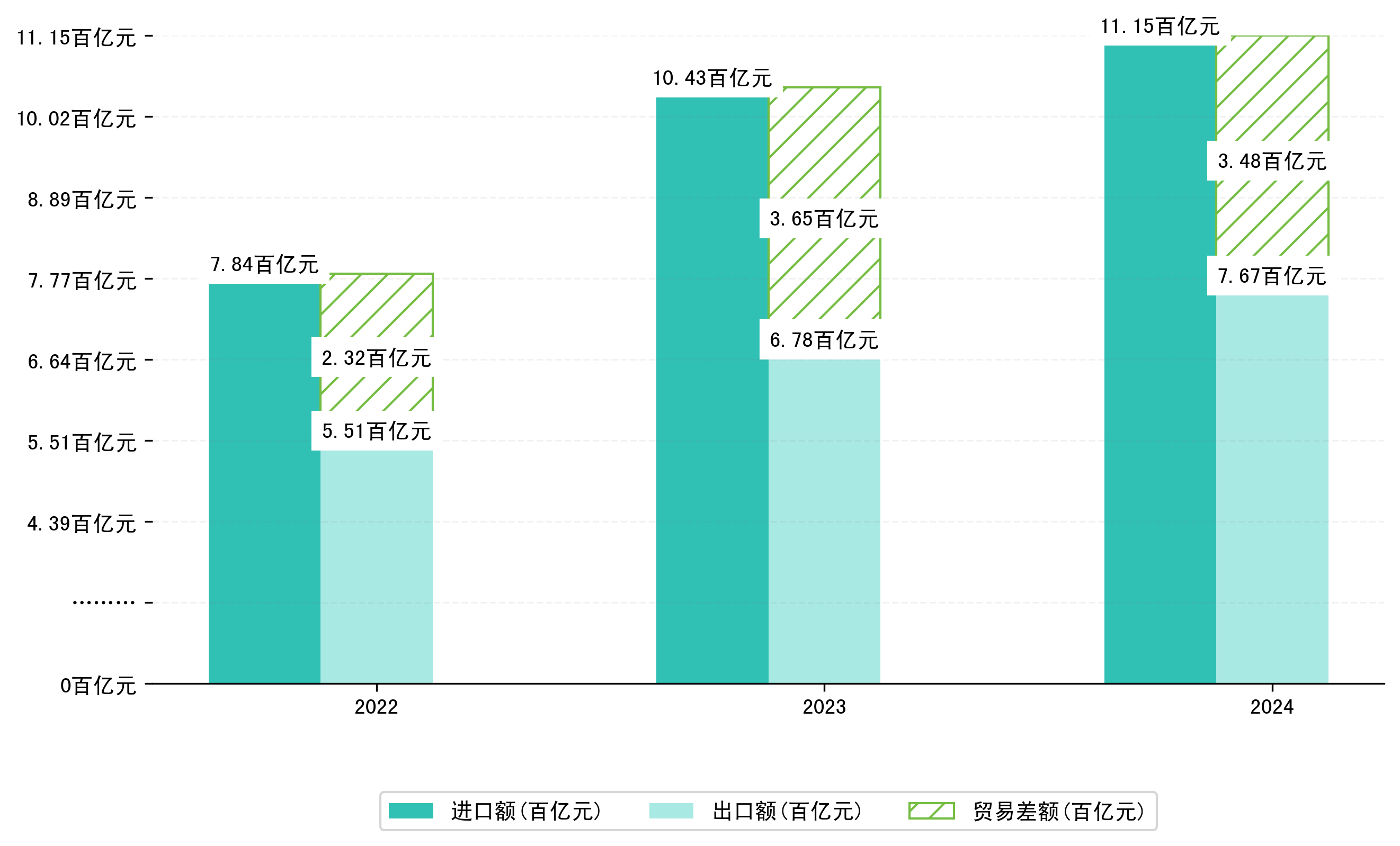 以人民币计,2024年1-11月内蒙古自治区贸易差额为347,8388,7278万元(贸易逆差),相比上年同期增加了16,9292,1840万元,同比增加-4.64%。