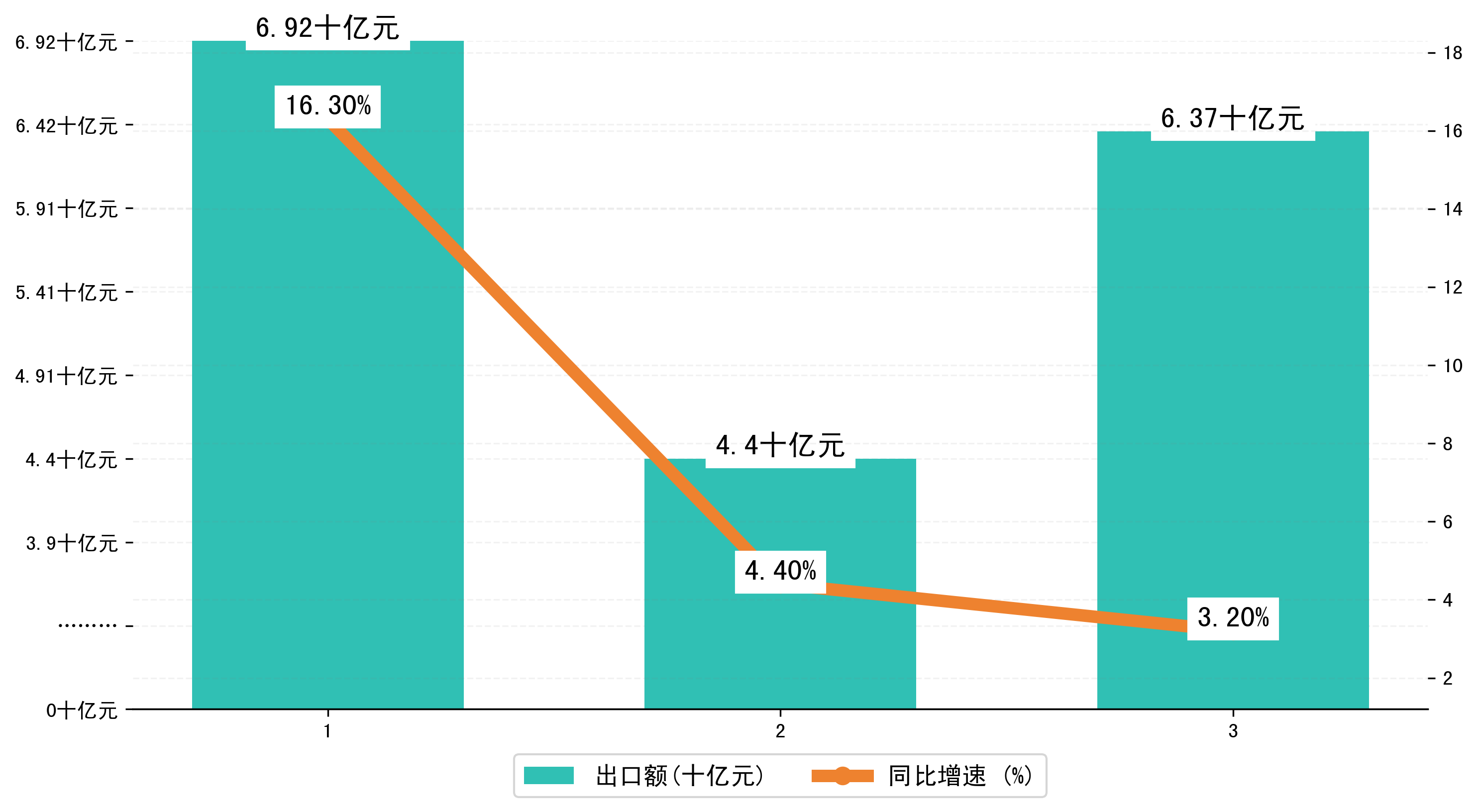以人民币计,2024年1-3月内蒙古自治区出口额为176,9787.7637万元,相比上年同期增加了3,3764.1687万元,同比增加了3.20%。