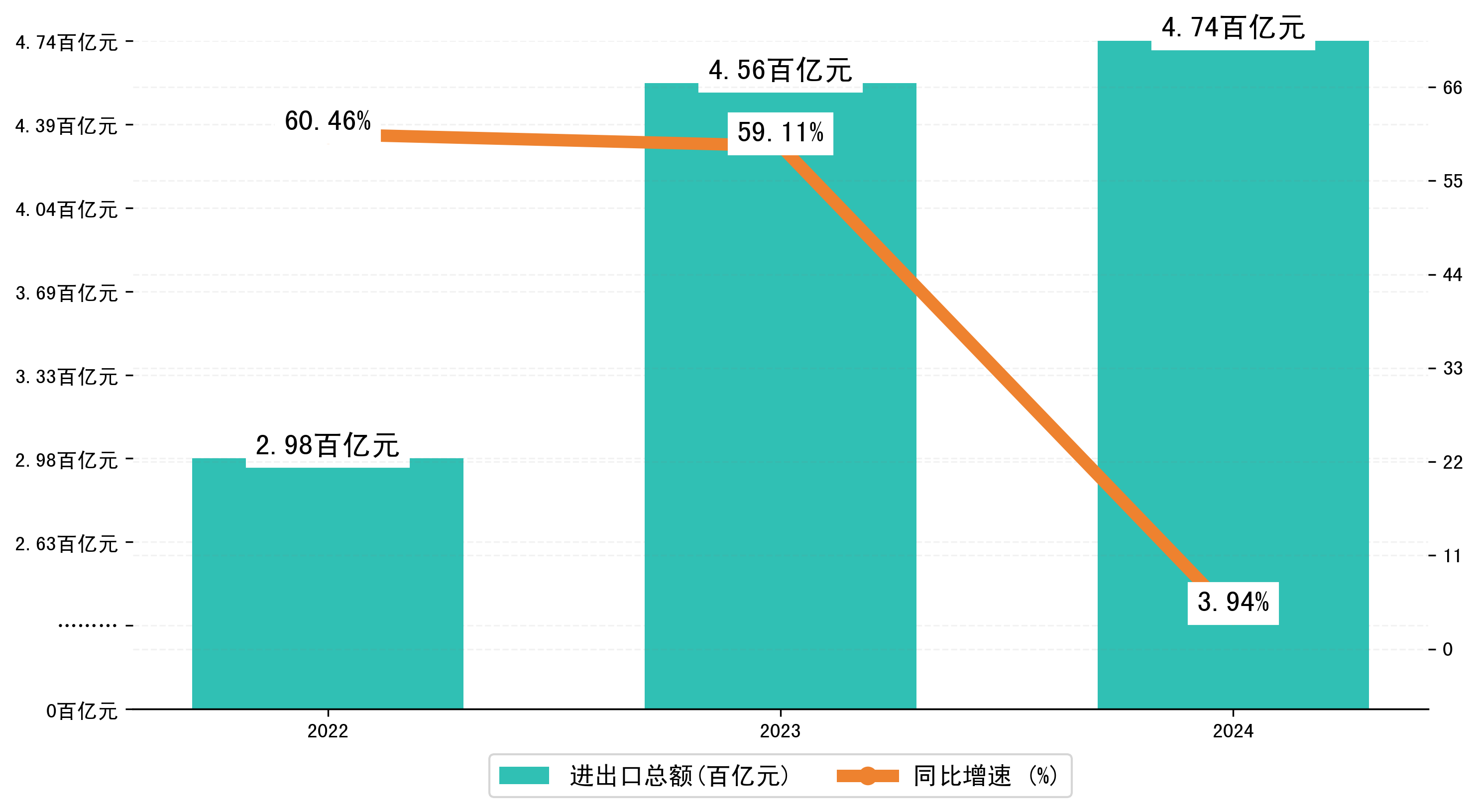 以人民币计,2024年1-3月内蒙古自治区进出口总额为474,2095.5007万元,相比上年同期增加了17,9910.1767万元,同比增加了3.70%。