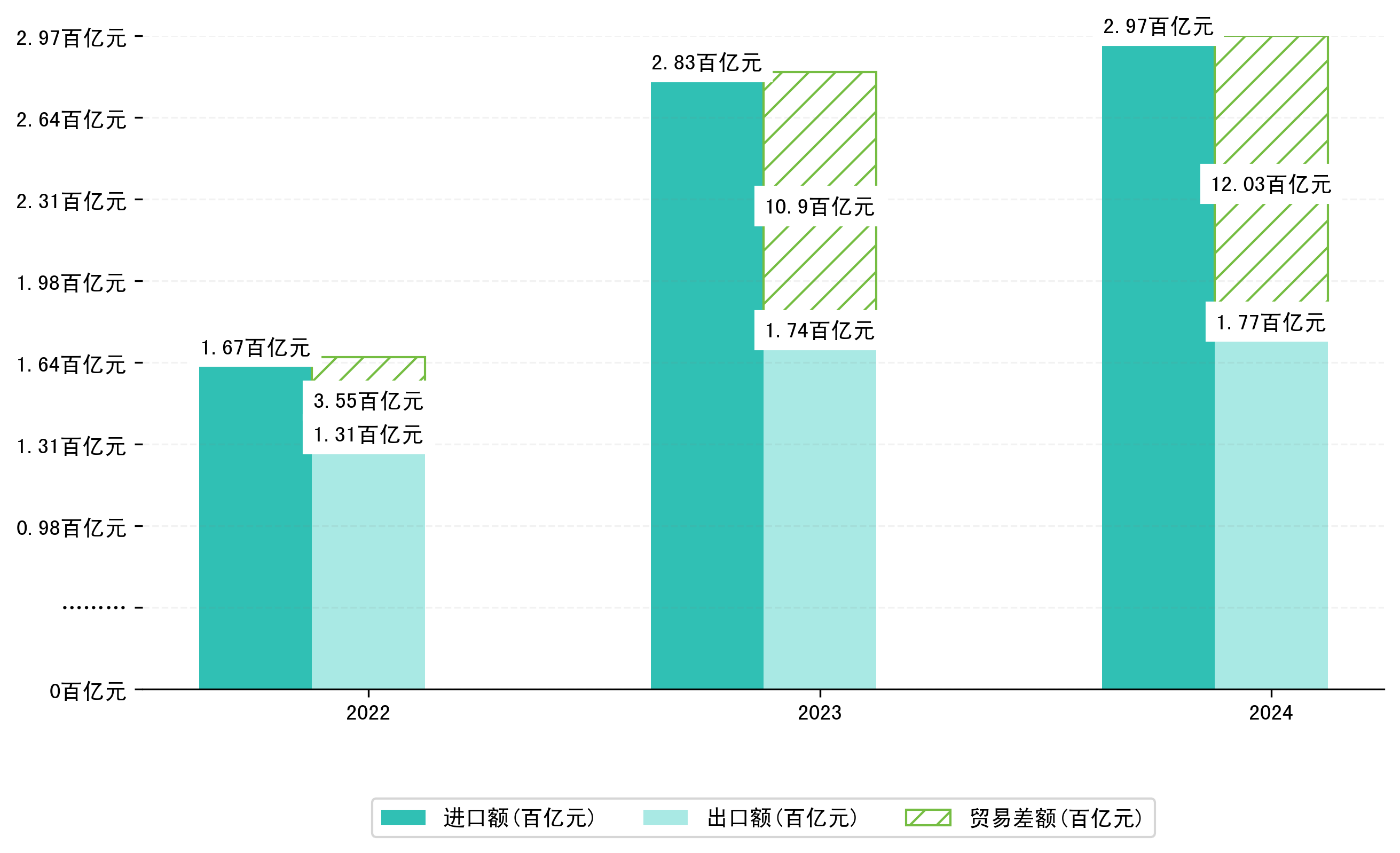以人民币计,2024年3月内蒙古自治区贸易差额为40,4907,0459万元(贸易逆差),相比上月增加了6,8314,3620万元,即9586,1579万美元;相比上年同期减少了4,7444,7360万元,同比减少13.27%。